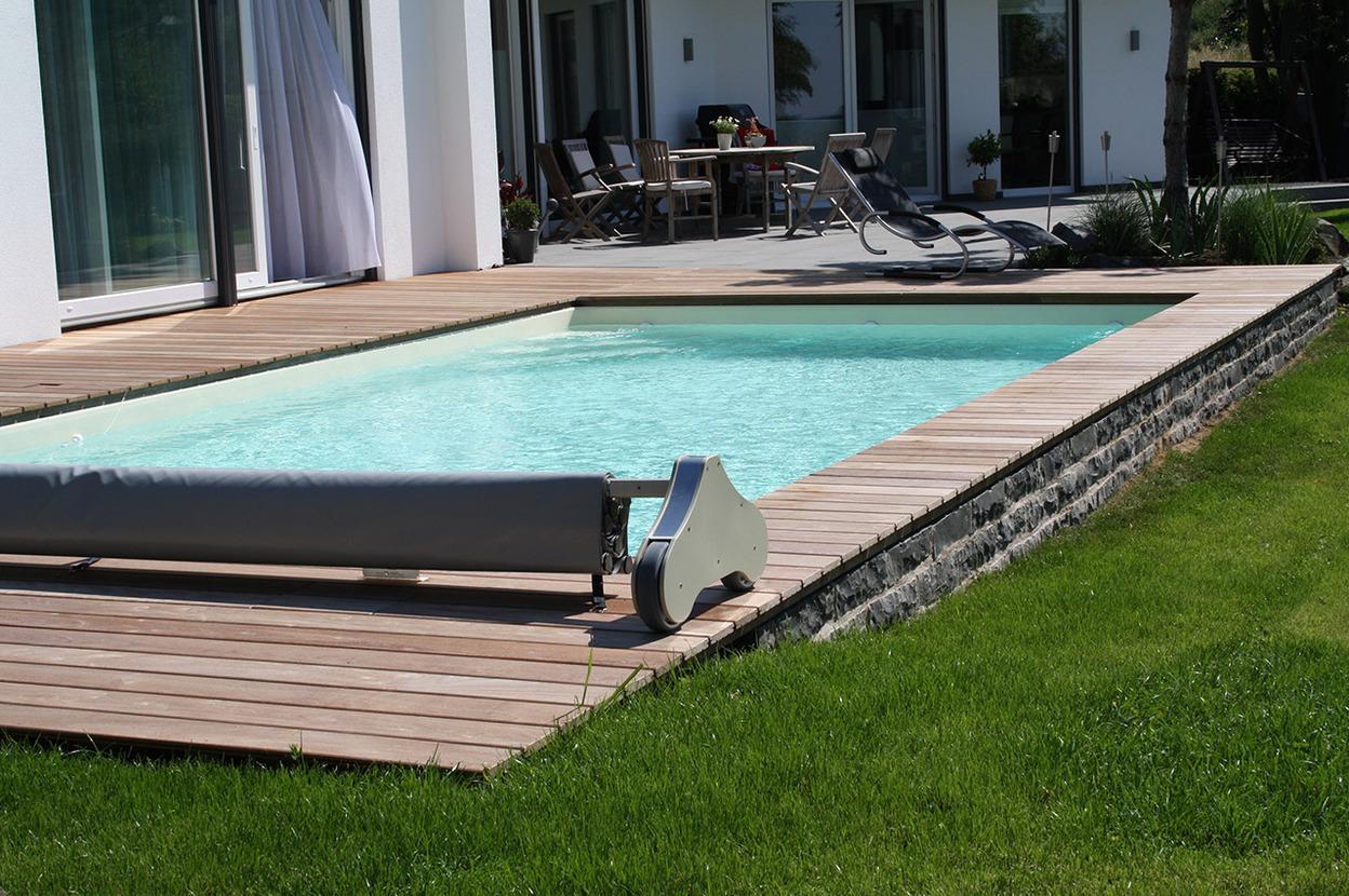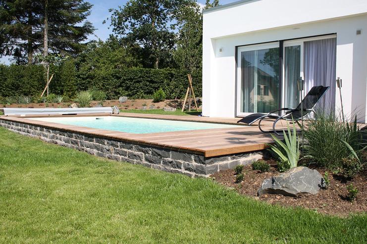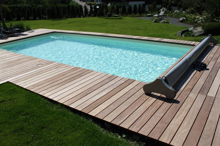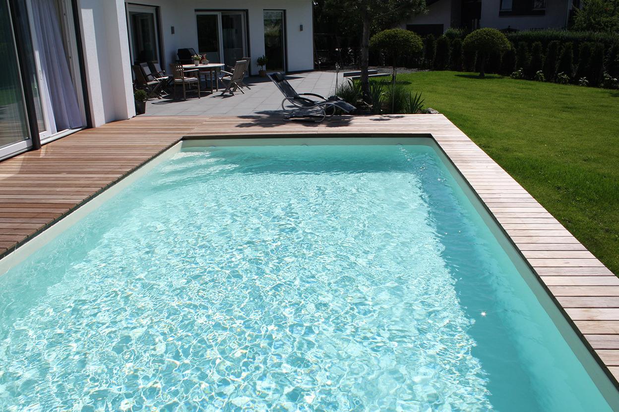 Hier sehen Sie eine Poolumrandung aus Holz in verschiedenen Perspektiven. Die Holzfläche wurde flächenbündig an die Steinterrasse angelegt. Das Holz steht ca. 2 cm über der Wasseroberfläche und dient damit gleichzeitig als Wellenbrecher.