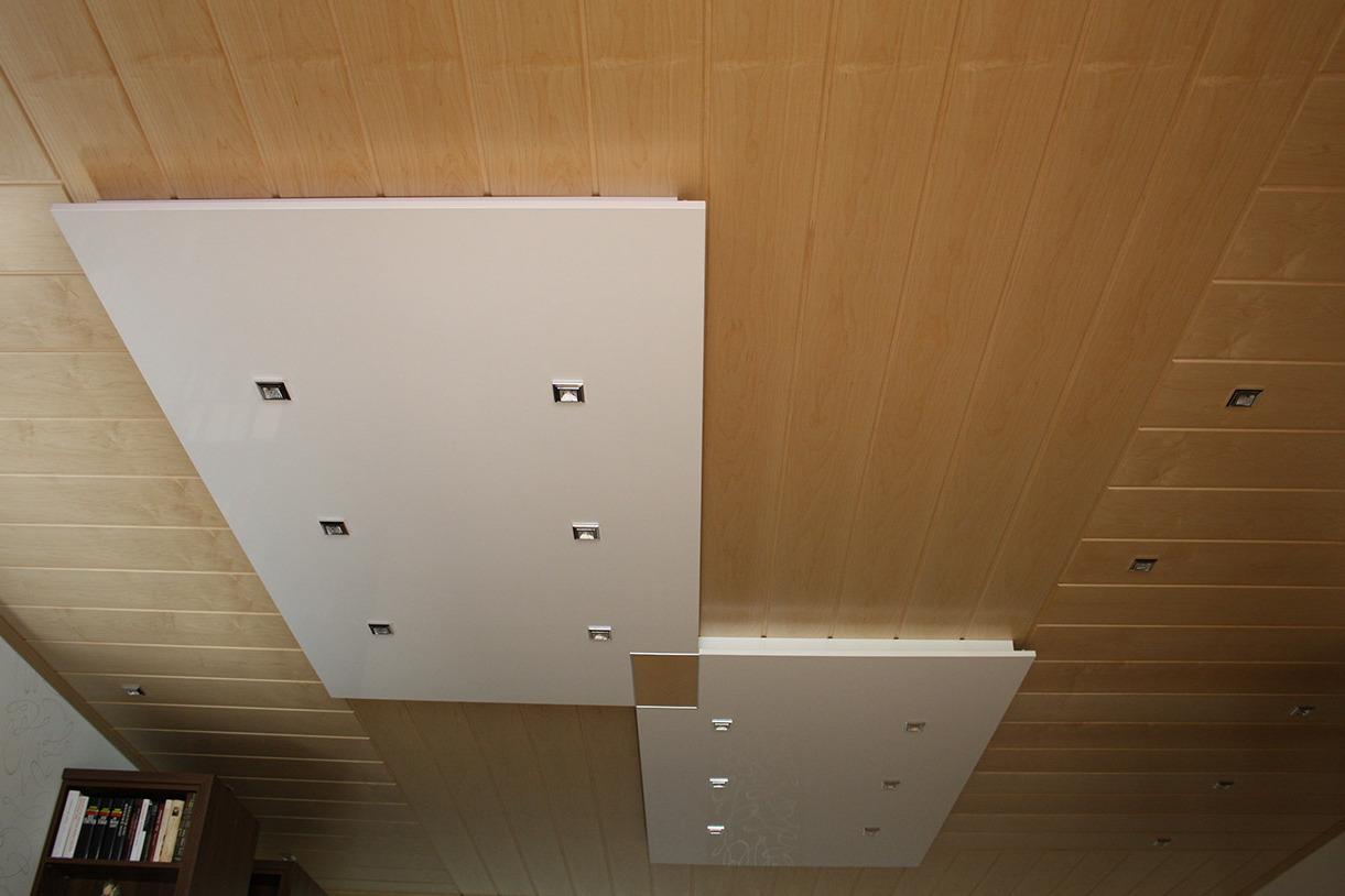 Hier wurde eine Kombination aus Holzdecke mit einem abgehängten Deckensegel aus Hochglanzplatten mit individueller Beleuchtungstechnik vereint. Die Holzdecke aus Can. Ahorn echtholzfurnierten Deckenpaneele, wurde in unterschiedlichen Richtungen verlegt und an wichtigen Beleuchtungsstellen sind eckige Einbaustrahler integriert worden. Auf diese Holzdecke wurde nun eine komplexe Unterkonstruktion gebaut, welche die beiden Deckensegel aus weißen Hochglanzplatten aufnimmt und durch die Abhängung optisch schweben lässt.