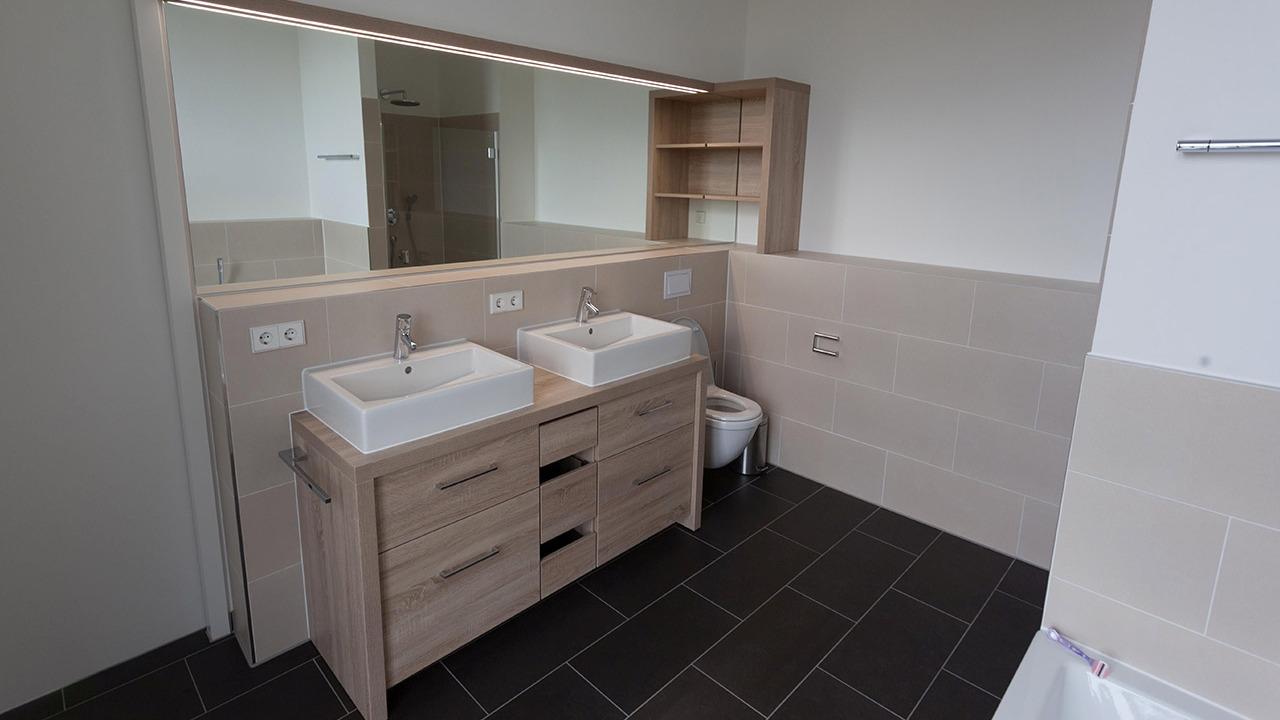 Hier haben wir ein komplettes Badezimmer mit verschiedenen maßgefertigten Badmöbel im Dekor Badolino Eiche ausgestattet. Der Waschtisch unter den Doppelwaschbecken wurde mit verschiedenen großen Schubkästen ausgestattet, um alle wichtigen Badutensilien verstauen zu können.