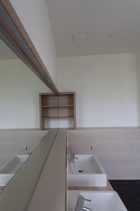 Die oberen beiden Schubkästen sind mit einer speziellen Syphon-Schublade ausgestattet, um so viel wie möglich Stauraum nutzen zu können. Ein offenes Regal wurde an den Spiegel angepasst mit einer angeschlossenen LED-Lichtleiste, die den Spiegel beleuchtet. Ein Hochschrank in einer Raumnische bringt den nötigen Stauraum für Handtücher, Wäsche und vieles mehr.