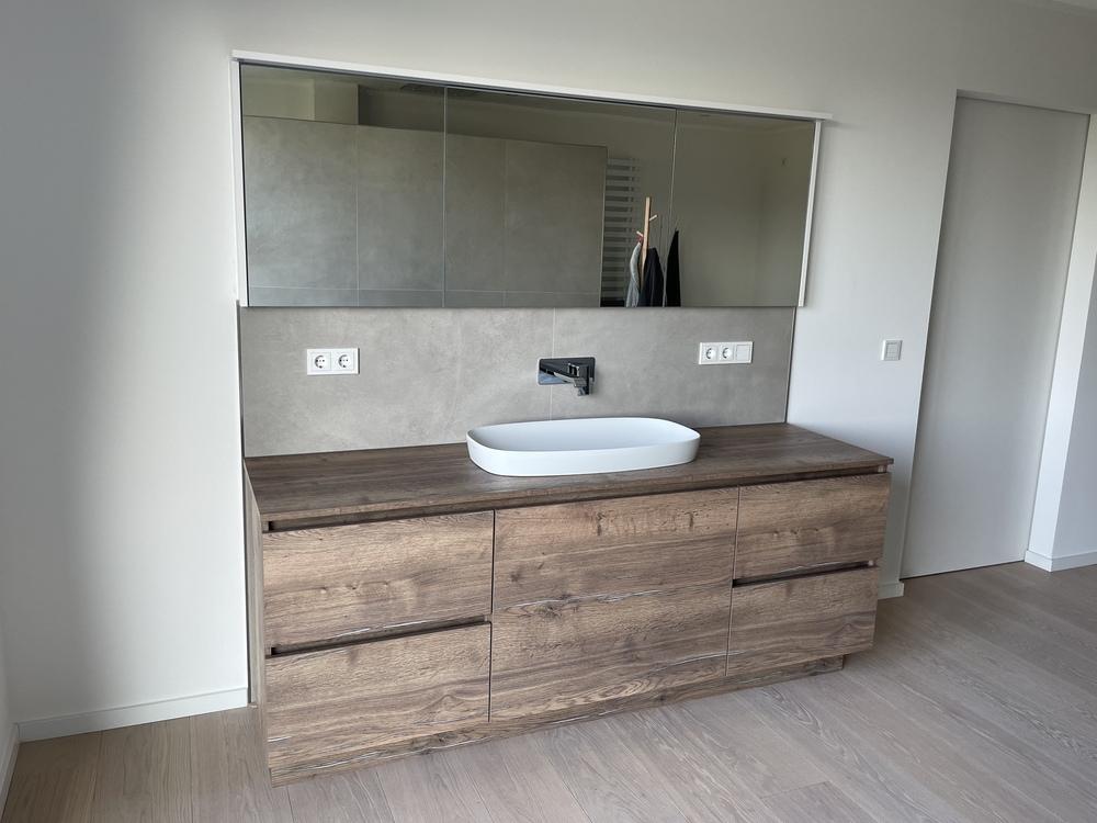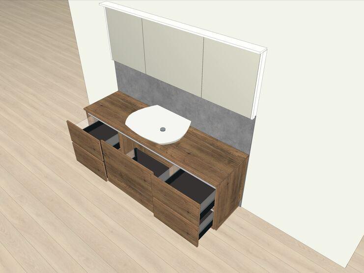Der Waschtischschrank sollte das Aufsatzwaschbecken hervorheben und gleichzeitig klare Linien zeigen, sowie wärme durch das Holzdekor bringen zugleich aber mit dem Parkettboden nicht konkurrieren. Dadurch wurde sich für das EGGER Feelwood-Dekor „Halifax Eiche Zinn“ entschieden, bei dem die Struktur der Holzoptik auch haptisch fühlbar ist. Auch wichtig war hier das der Maserverlauf über die gesamte Frontbreite wie aus einem Guss wirken soll. Die Grifflosen Fronten werden durch eine Griffmulde in gleichem Dekor wie die Front bedient, somit ist der Frontanblick komplett in Holzoptik und es stört keine Metallunterbrechung die Frontansicht. Die geräumigen Schubkästen mit Glasseite geben Einblick in den Stauraum. Beim mittleren Frontauszug hinter dem sich der Siphon verbirgt, wurde noch ein kleiner Abfalleimer integriert.