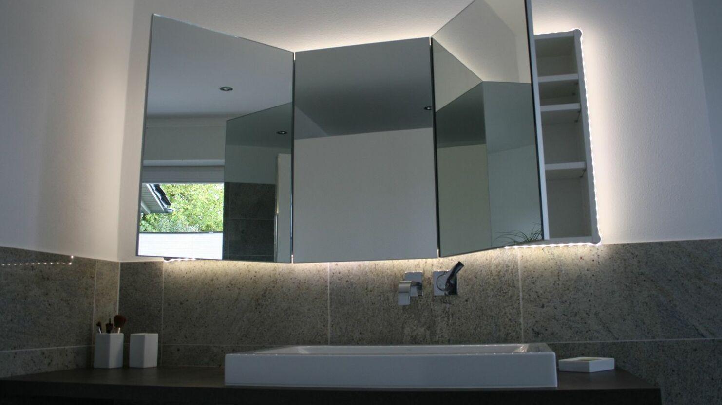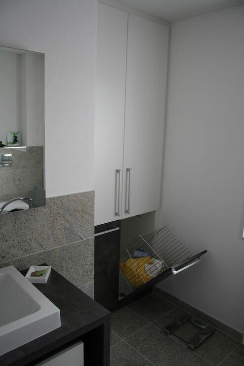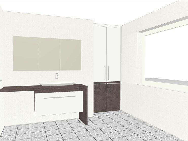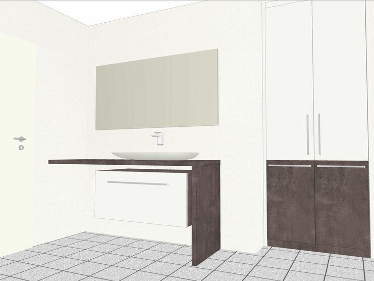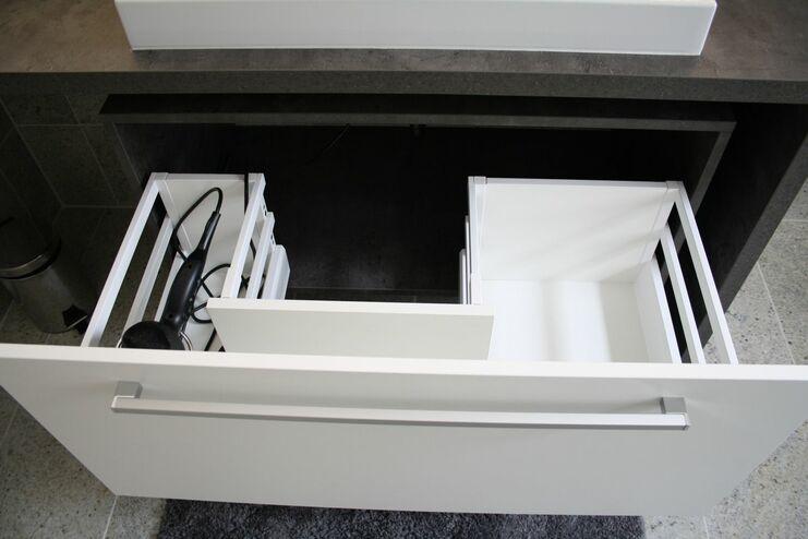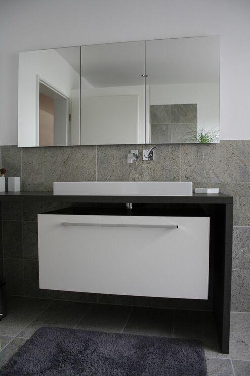 Der L-Form Waschtisch, der zu schweben scheint, ist mit einem breiten Aufsatzwaschbecken ausgerüstet. Darunter wurde ein schwebender Unterschrank mit breitem Schubkasten und Aussparung für Syphon und Wasseranschlüsse gebaut. Im Schubkasten integriert ist ein Fönhalter und durch die im Vorfeld geplante Steckdose wird daraus eine Fönschublade. Der Spiegelschrank wurde in eine vorhandene Mauernische integriert und mit einer LED-Beleuchtung hinterleuchtet, um ein indirektes Wohlfühl-Licht zu erzeugen. Ebenso wurden Steckdosen in den Schrank integriert, um z. B. elektrische Zahnbürste oder elektrischen Rasierer anzuschließen und bei verschlossener Spiegeltür aus dem Sichtbereich zu nehmen.