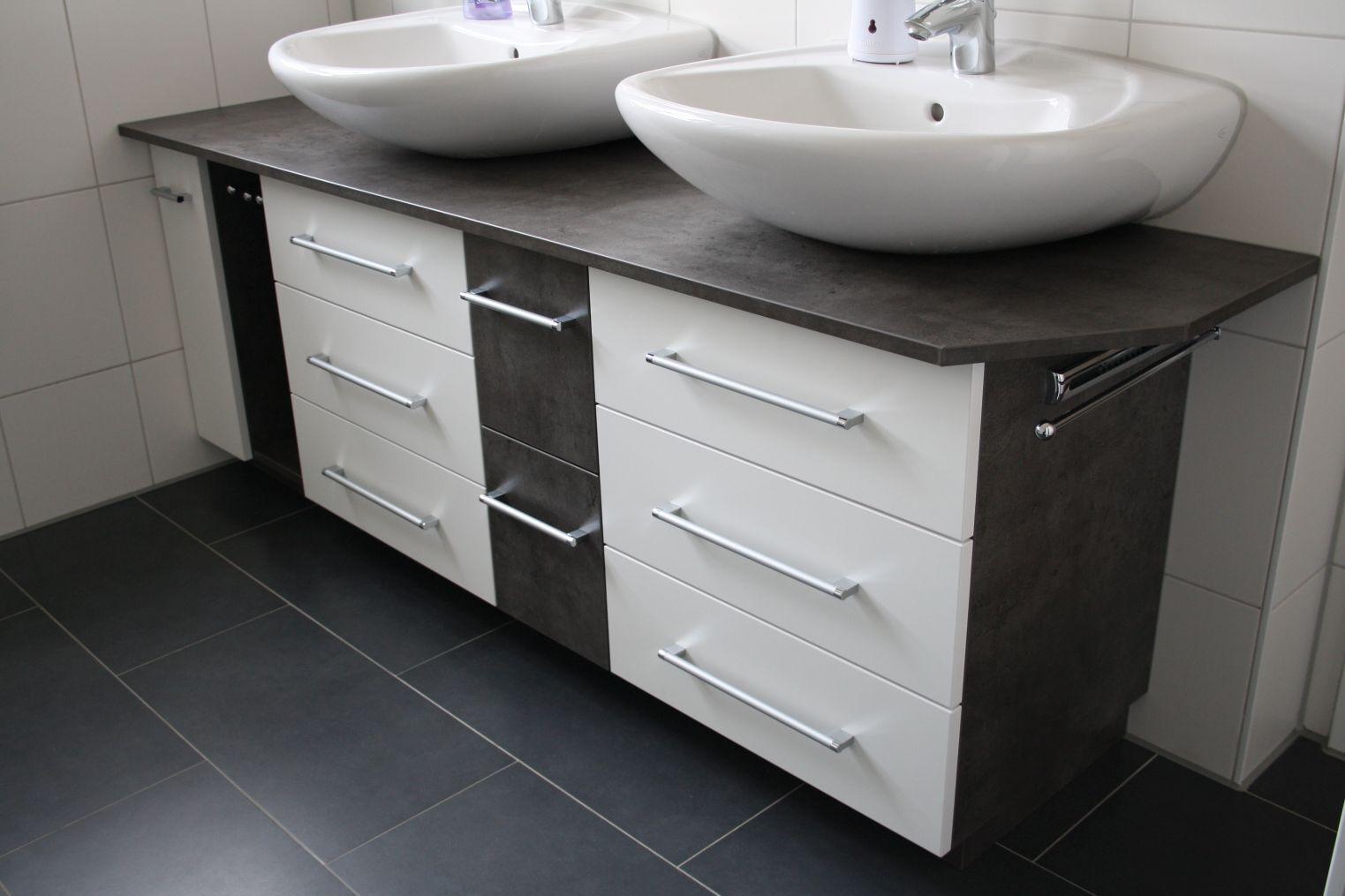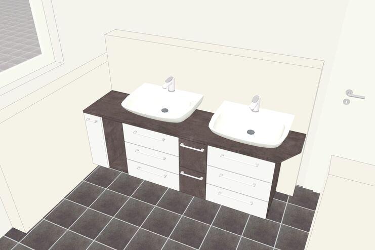 Diesen Waschbeckenunterschrank haben wir an die vorhandenen Doppelwaschbecken und die Raumsituation angepasst, mit der Vorgabe möglichst viel Stauraum zu bieten und für 4 Personen Handtücher griffbereit zu halten.