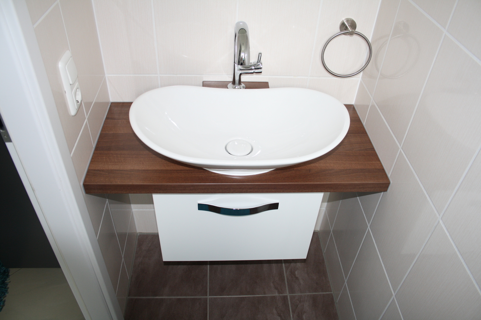Diese freihängende Waschtischplatte mit Unterschrank für ein Aufsatz-Handwaschbecken aus Nußbaum Dekor haben wir passgenau in die Wandnische eines Gäste-WC´s integriert. Hinter dem Waschbecken befindet sich ein kleines Podest, um die Armatur in der richtigen Höhe zum Waschbecken positionieren zu können und eine gute Bedienbarkeit für die Einhandmischarmatur zu gewährleisten.