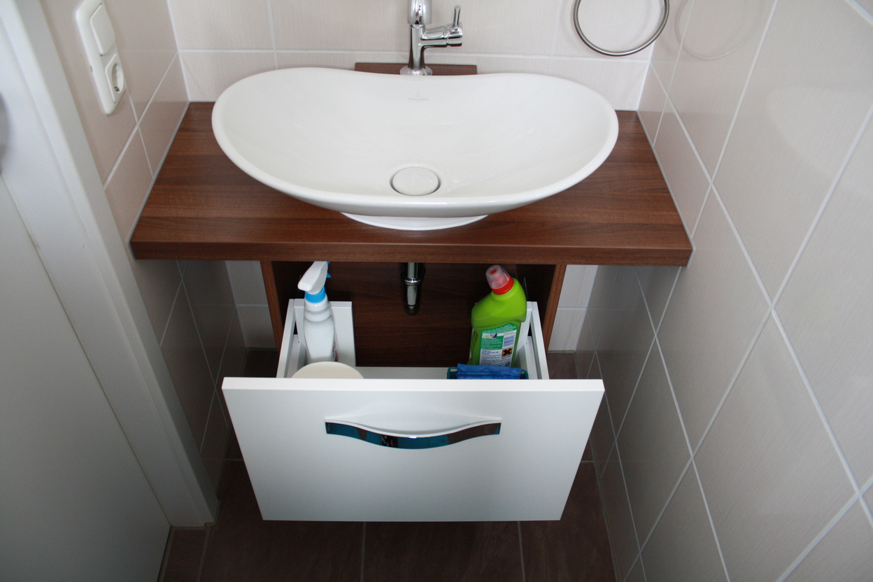 Unter der Waschtischplatte befindet sich ein Unterschrank mit einem hohen Schubkasten und einer weißen Dekorfront. Um kleine WC-Utensilien verstauen zu können und gleichzeitig den Syphon und den Wasseranschluß zu verdecken, hat die Schublade hinten eine Syphon-Aussparung.