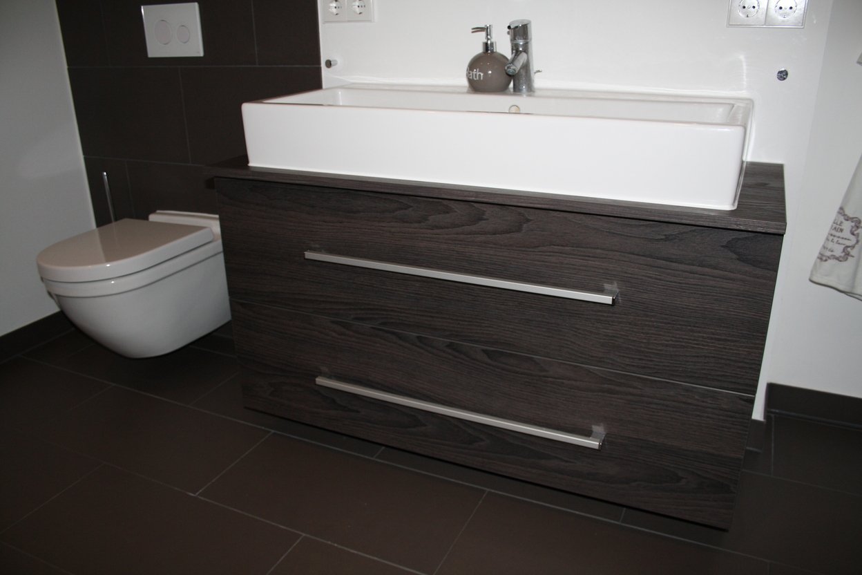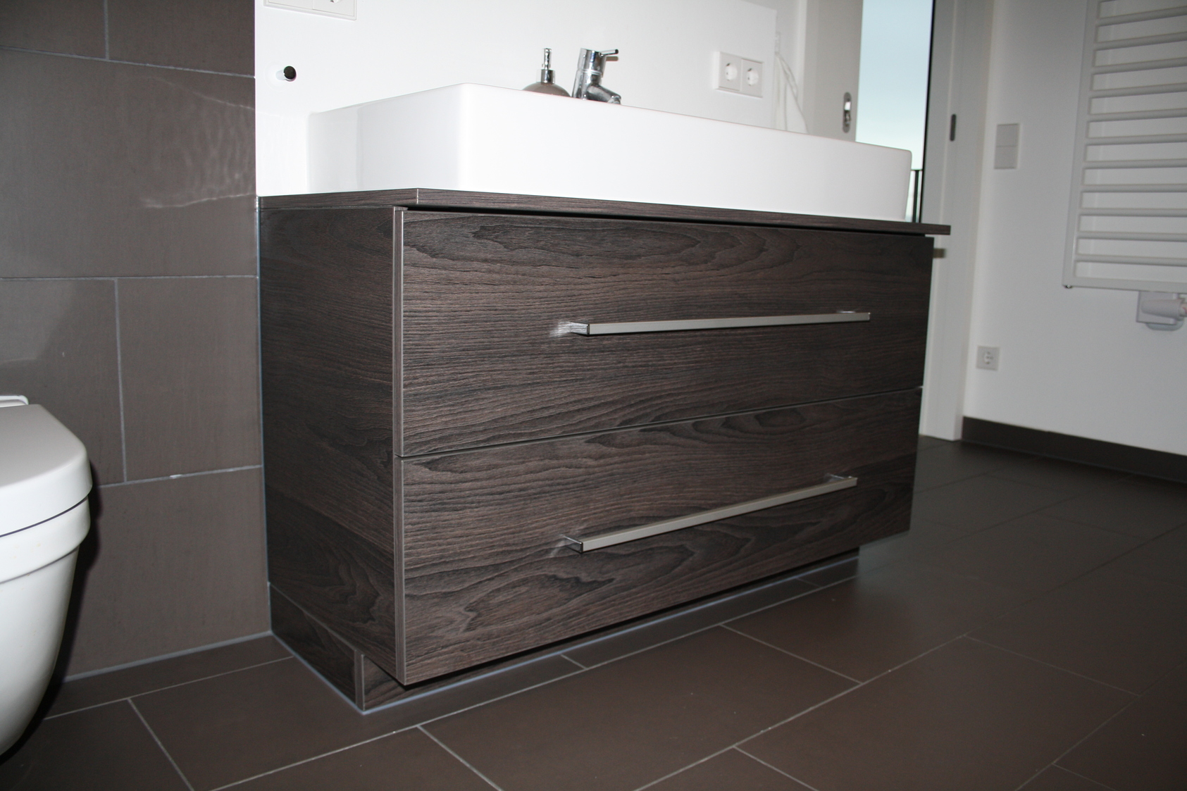 Diesen Waschbecken-Unterschrank haben wir für unseren Kunden in der EGGER Dekor-Oberfläche „FEELWOOD“ mit beidseitiger Synchronpore in der Optik „Cape Elm dunkelbraun“ gefertigt und montiert.