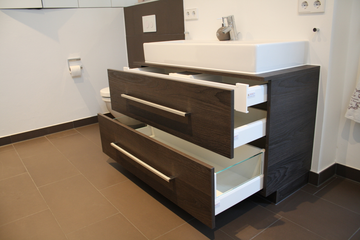Dadurch, dass sich in dem oberen Schubkasten hinter der Blende ein weiterer Innenschubkasten verbirgt, wird hier der Stauraum für Kleinutensilien im Bad optimiert. Obwohl hier Sonderschubkästen mit Siphonausschnitt gebaut wurden, ist der Stauraumverlust gering. Dies ist durch ein exaktes Aufmaß vor Ort am vorhandenen Waschbecken und einer genauen Planung bei uns möglich.