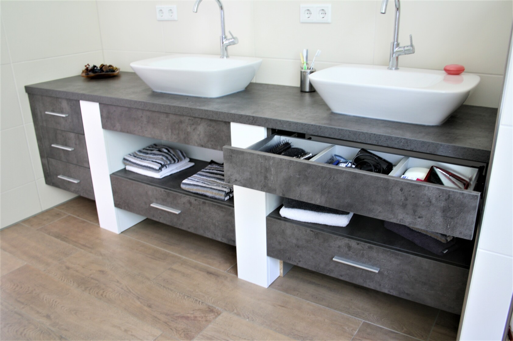 Waschtischschrank mit Aufsatzwaschbecken in “Beton dunkel”- Dekor und weißen Mittelsäulen.