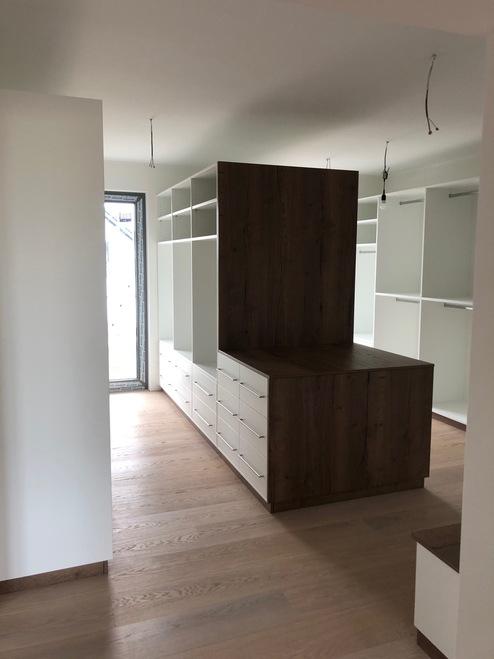 Wir haben dieses ca. 24 m² große Ankleidezimmer komplett, ausgestattet mit unseren maßgefertigten Möbeln für viel Platz und übersichtlicher Ordnung für alle Kleidungsstücke.