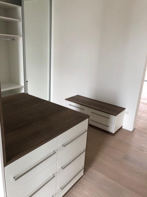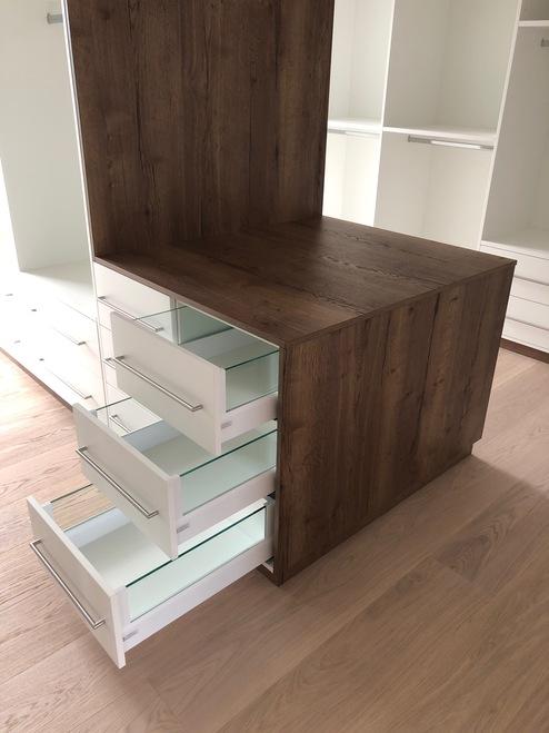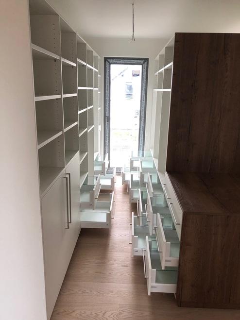 In einer vorangegangenen detaillierten Planung gemeinsam mit unserem Kunden haben wir Platz geschaffen, um mit insgesamt ca. 11 lfm. Kleiderstangen ,34 Schubkästen und ca. 56 offenen Fächern (in diversen Größen) alle Kleidungsstücke übersichtlich und optimal unterzubringen. Die Schubkästen sind mit Glasseiten ausgestattet, um einen Überblick in die Schublade zu erhalten.
