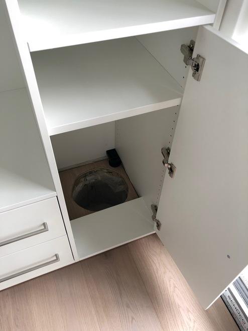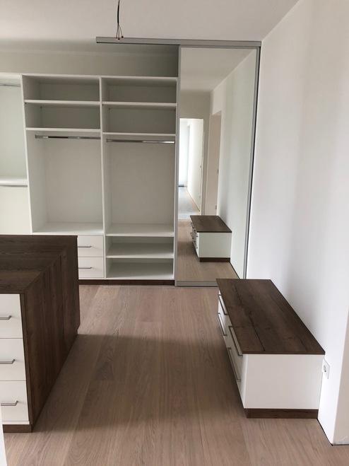 Integriert wurde auch ein Wäscheabwurf, ein Verteilerkasten für die Fußbodenheizung und eine raumhohe Alu-Gleitschiebetür mit Spiegelfläche. Der abgesenkte Mittelblock bietet Platz um Kleidungsstücke zusammen zulegen oder ein passendes Outfit zusammen zustellen. Auf der gegenüberliegenden Sitzbank mit Schubkästen kann dann der passende Schuh bequem angezogen werden.