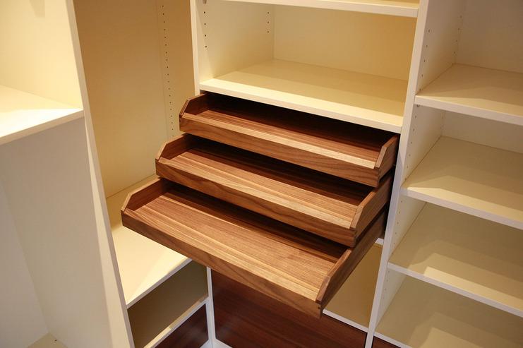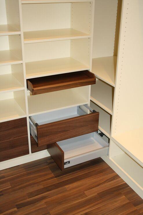 In die Schubkasten mit grifflosen Fronten und Push-to-open Öffnungs-System können kleinere Kleidungsstücke, Unterwäsche und Accessoires verstaut werden. Die offenen Schubkastenauszüge aus Nussbaum Massivholz werden zur Aufbewahrung von Taschen, Uhren und Schmuck genutzt. Um die Raumhöhe der Schränke ausnutzten zu können sind in 3 Abteilen im oberen Bereich Kleiderlifte eingebaut, damit man auch auf diese Kleidungsstücke einen bequem Zugriff erhält. Das Ankleidezimmer wird durch eine raumhohe Glas-Alu-Schiebetüre verschlossen. Für diese Schrankanlage war eine gewissenhafte und intensive Planung nötig, um dem Kundenwunsch gerecht zu werden.