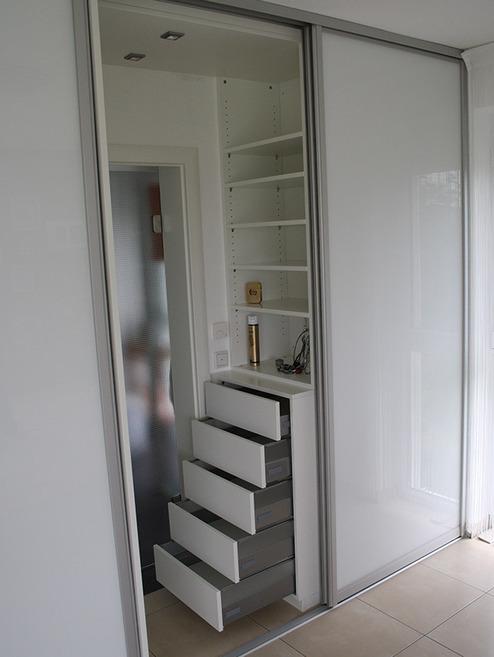 Der rechte Teil ist etwas zurückgesetzt und schließt mit der Fensterlaibung ab. Hier wurden 2 Korpusteile im 90° Winkel aneinander gesetzt, um den Stauraum bestmöglich zu nutzen. In den unteren Bereichen sind grifflose Schubkästen mit Vollauszug und “Push to Open”- Mechanik eingebaut. Darüber sind variabel verstellbare Regalböden eingebaut. In diesem Bereich wurde die Badtür in den Schrank mit eingebunden, so das diese bei geschlossener Front-Schiebetür nicht sichtbar ist. Im Schrankdurchgang zum Bad wurde ein Schrankoberboden mit Decken-Beleuchtung integriert.