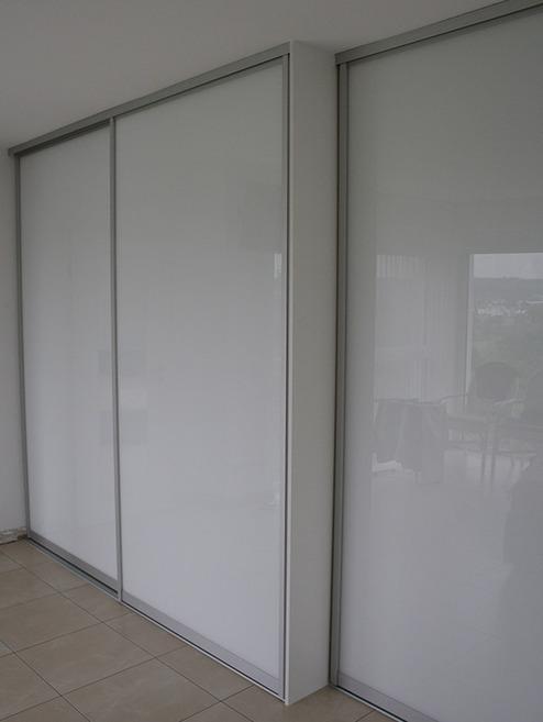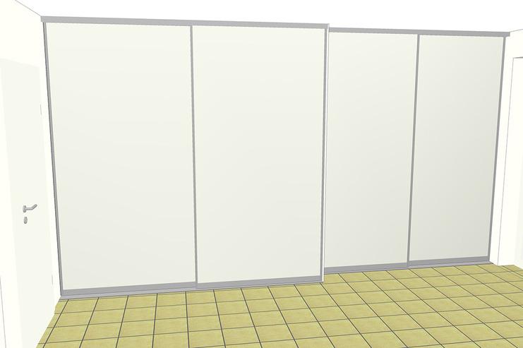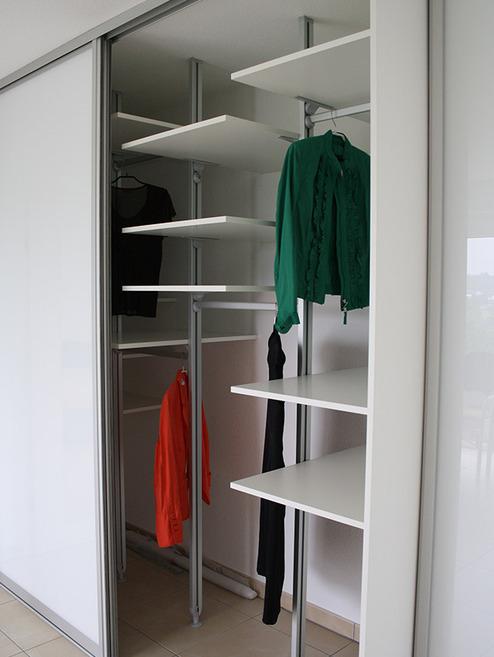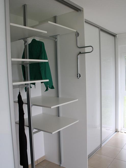 Dieses flexible Schranksystem aus raumhohen Aluminium-Profilen haben wir als Kleiderschrank an einer Wandseite montiert. Vor dieses Schranksystem haben wir zwei raumhohe Aluminium-Schiebetüren mit Füllungen aus weiss beschichteter Dekorspanplatte eingesetzt. Die Schiebetüren sind nach beiden Seiten verschiebbar und schließen sanft durch einen Dämpfungsmechanismus. Durch eine gute Vorplanung des Schranksystems konnten wir den Stauraum auf die Bedürfnisse des Kunden optimieren, so dass alle Kleidungsstücke einen perfekten Platz erhalten sowie ein guter Überblick und Zugriff auf die Kleidung gewährleistet ist. Das Schranksystem wurde hier mit Einlegeböden und Kleiderstangen ausgestattet. Ebenso wurde ein vorhandener Schrank vom Kunden in das System integriert.