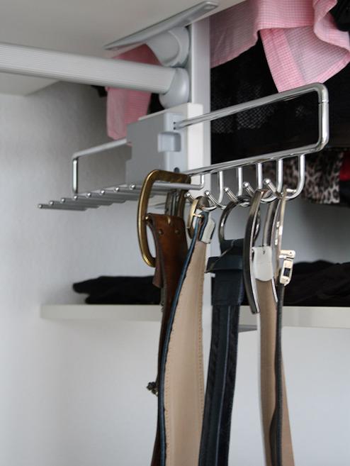 Der linke Teil wurde bewußt tiefer gebaut, um mehr Freiraum für die Kleidung zu haben (damit beim Schließen der Türen keine Ärmel von Jacken, Blusen oder Hemden eingeklemmt werden). In diesem Teil wurde eine flexible und luftige Schrankeinteilung aus Aluminiumprofilen gewählt, um den Innenbereich freier und luftiger zu gestalten. Ebenso wurde ein herausziehbarer Gürtelhalter in das Schienensystem integriert und eine herausdrehbare Kleiderstange, um Kleidungsstücke zu lüften.