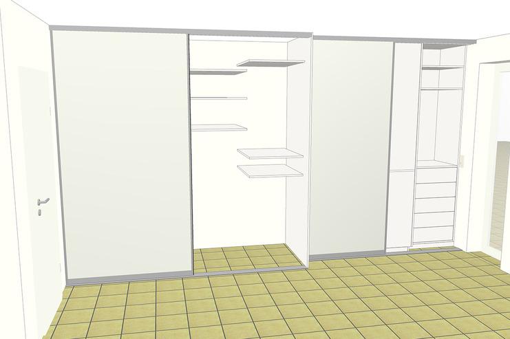 Der Kundenwunsch bestand darin, eine komplette Schlafzimmerwand mit einem schlichten Kleiderschrank zu gestalten, wobei die Tür zum Badezimmer sowie das Fenster rechts bedienbar bleiben sollten.