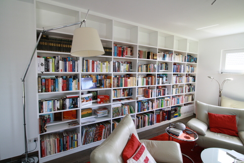 Diese raumhohe Bibliothek mit Mehrwert haben wir an die vorhandene Wandfläche angepasst und mit einer 2. Bücherebene ausgestattet. Dies ist eine Eigenentwicklung, die es speziell bei unseren Bibliotheken gibt, um noch viel mehr Taschenbücher und Lieblingsromane unterbringen zu können.