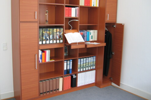 Die Regalböden sind variabel verstellbar, um diese an unterschiedliche Buchhöhen anzupassen. Ein Kleiderabteil für Jacken, Mäntel und Roben wurde auch in den Schrank integriert. Der Schreibtisch in Form eines 1/3-Kreisbogen bietet genügend Platz, um alle Arbeiten uneingeschränkt ausführen zu können und ebenso Mandantengespräche zu führen. Unter dem Schreibtisch befindet sich ein verschließbarer Rollcontainer mit Stahlschubladen, um Büromaterialien unterbringen zu können. Hinter dem Schreibtisch ist ein Rollladenschrank in die Ecke plaziert worden, um dort einen Drucker aufzustellen und laufende Akten im Schrank zu verstauen, die sichtgeschützt aufbewahrt werden können.