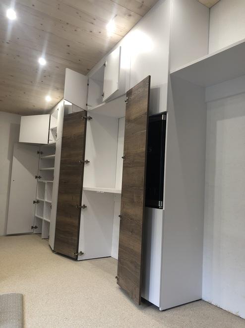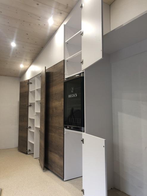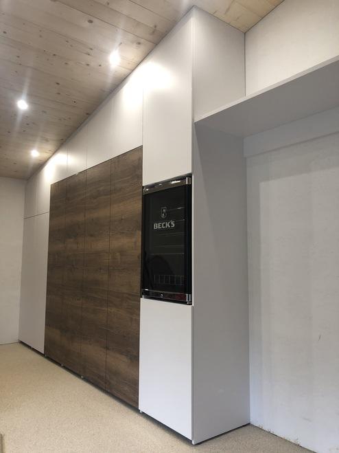 Der Wunsch eines integrierten Arbeitstisches der hinter Türen verschwindet, sowie der von außen bedienbare Glastürkühlschrank, konnten wir genauso erfüllen wie ein ansprechendes und zugleich zurückhaltendes Design. Durch den hauptsächlich in weiß gehaltenen Schrank, wirkt er trotz seiner bis zu 2,90 m Höhe und 3,60 m Breite nicht zu wuchtig. Die mittleren Türen mit der EGGER Feelwood-Oberfläche im Dekor „Halifax Eiche Zinn“ bringen trotzdem den gewünschten natürlichen Wohlfühlcharakter. Die grifflosen Türen wirken schlicht und lassen sich mittels BLUM TipOn-Mechanismus bis zu 170° öffnen.