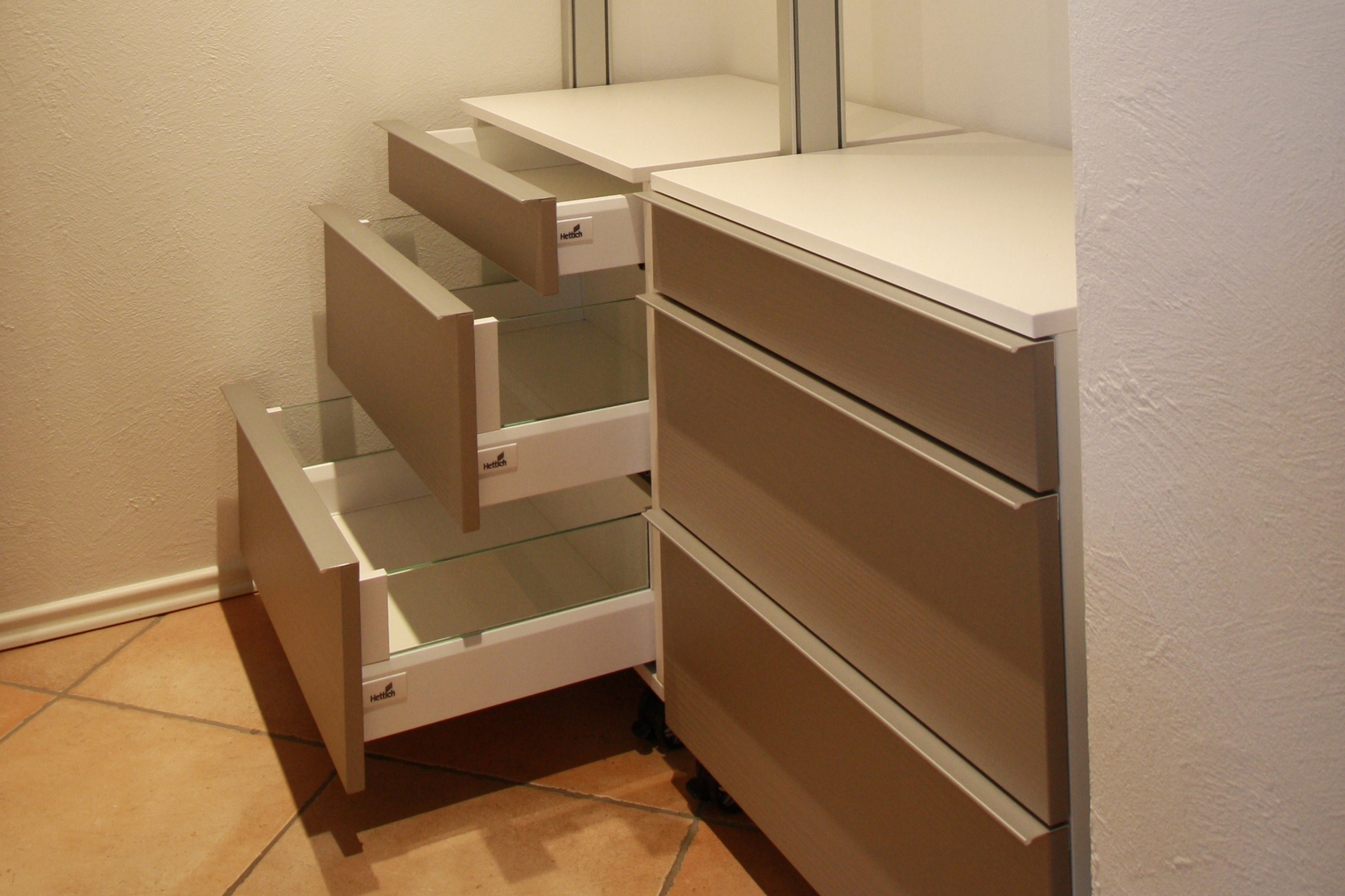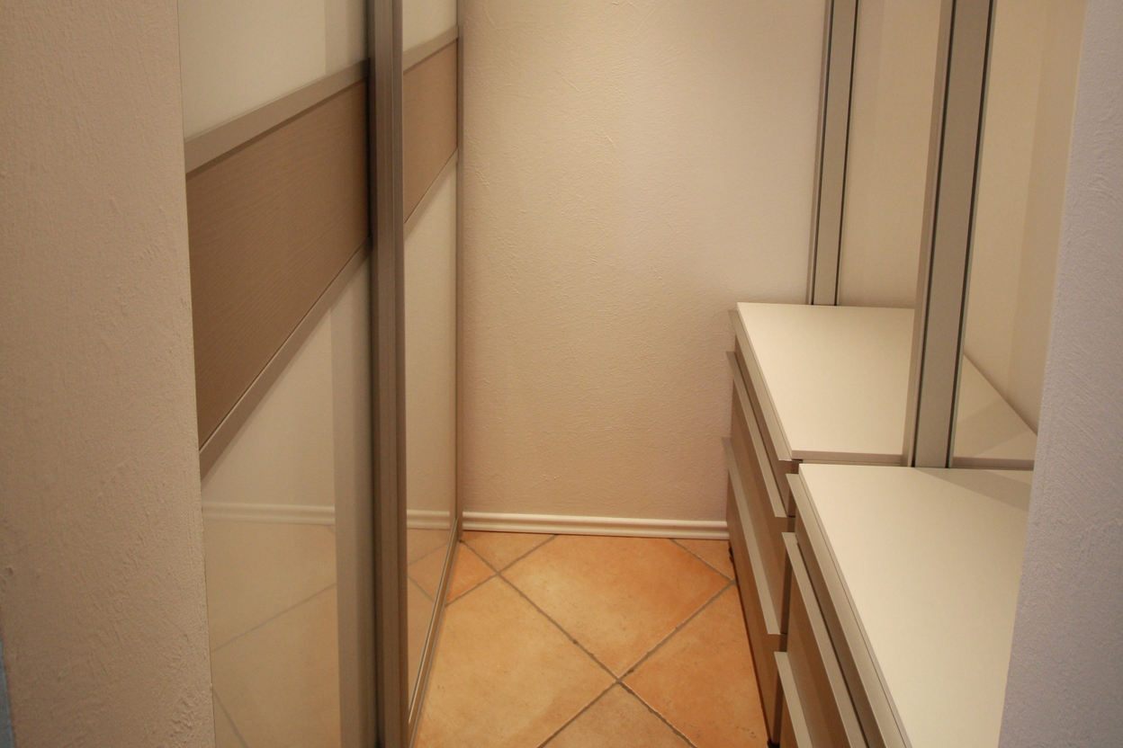 Auf der einen Seite ist ein raumhoher Schuhschrank mit variabel verstellbaren Schuhböden hinter Gleitschiebetüren mit Dekor- & Lackglasfüllung montiert. Die gegenüberliegende Seite ist mit einem offenen Garderobensystem mit Rollcontainern, Kleiderstangen und Ablageböden ausgestattet. Die Rollcontainer mit Schubkästen können herausgefahren werden, um bei eventuellen Reparaturarbeiten an die Revisionsklappe zu gelangen. Somit wurden durch eine exakte Vorplanung die geringen Platzverhältnisse optimal genutzt.