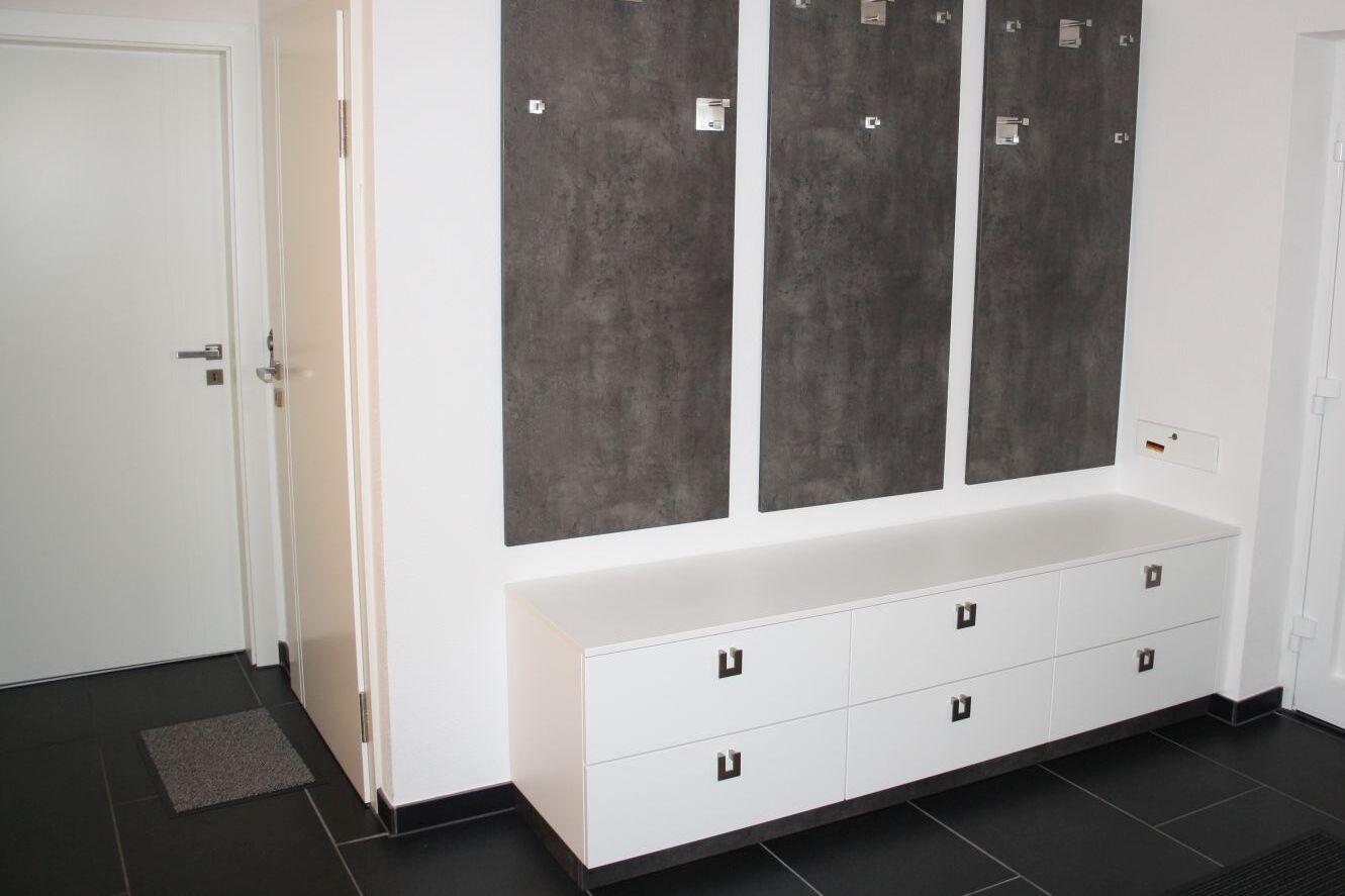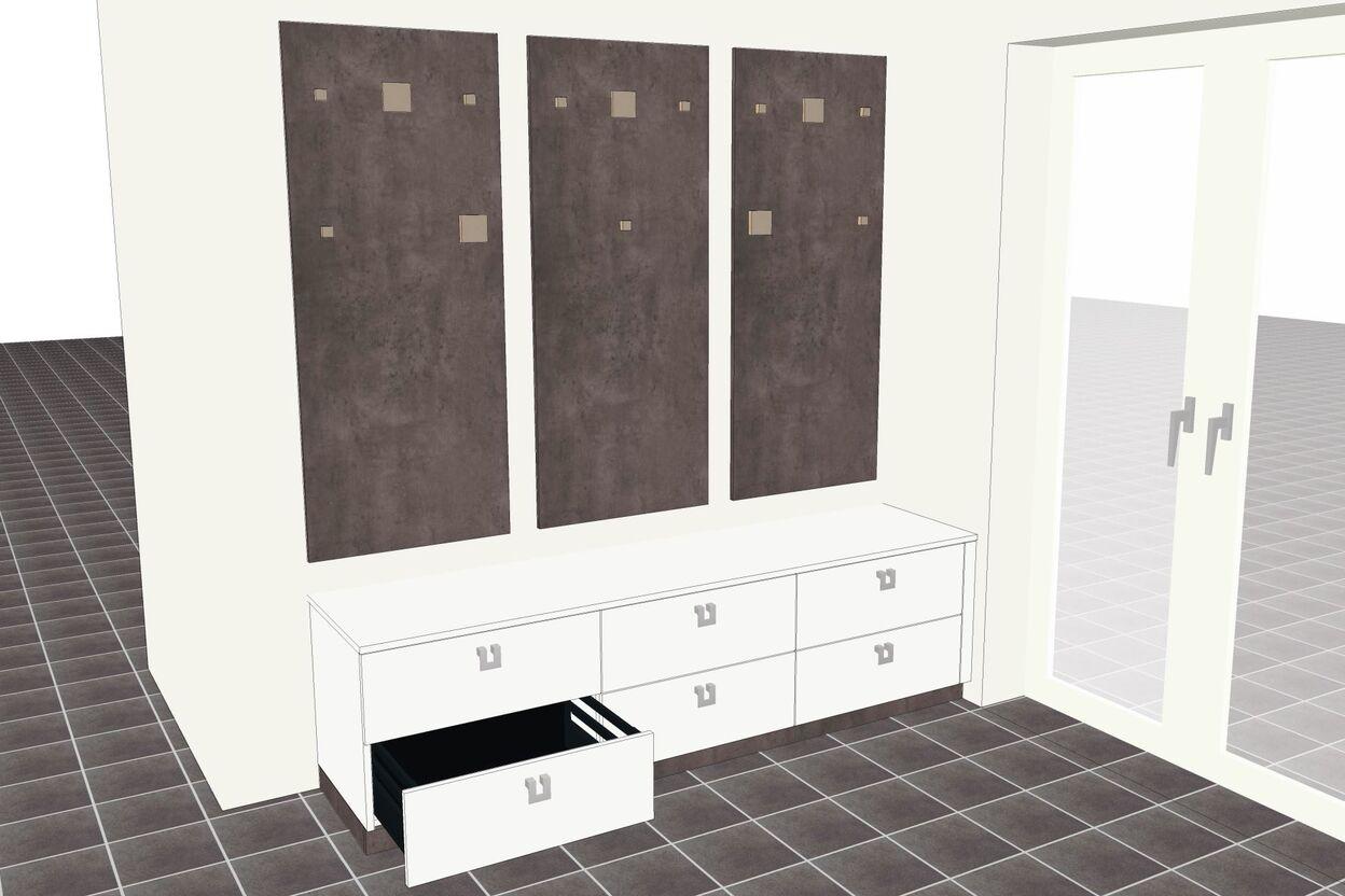 Diese Garderobe mit Schuhschrank hat 3 Paneelewände aus 19 mm EGGER Dekorspanplatte “Beton dunkel” mit Design-Garderobenhaken und darunter eine Schubladenkommode in “Premium Weiss” mit 6 Schubkastenvollauszügen, in der die Schuhe untergebracht werden.