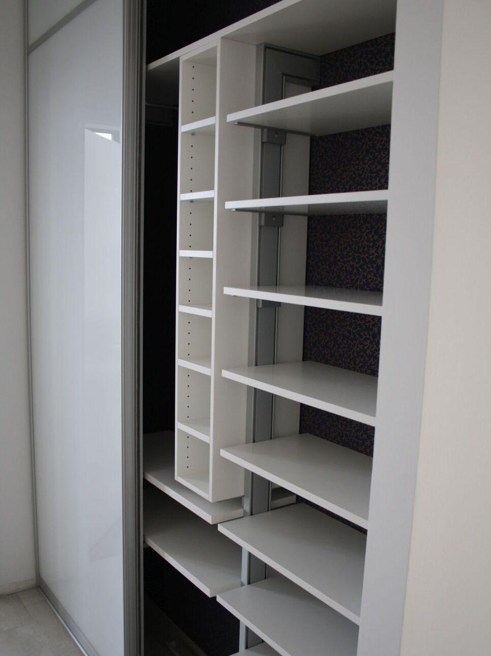 Ein weiterer Vorteil des Amari-Systems ist der freie Zugriff auf die Wand, in der sich diverese Revisionsklappen befinden (welche hier vom Kunden sehr perfekt und kaum sichtbar übertapeziert wurden). Ebenso konnte mit dem Amari-System die schmale Grundfläche von nur 330 mm optimal genutzt werden. Ein Highlight sind bei dieser Garderobe die raumhohen Alu-Gleitschiebetüren mit Spiegelfüllung und mit lackierter Glasfüllung in weiß.
