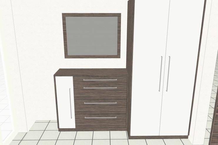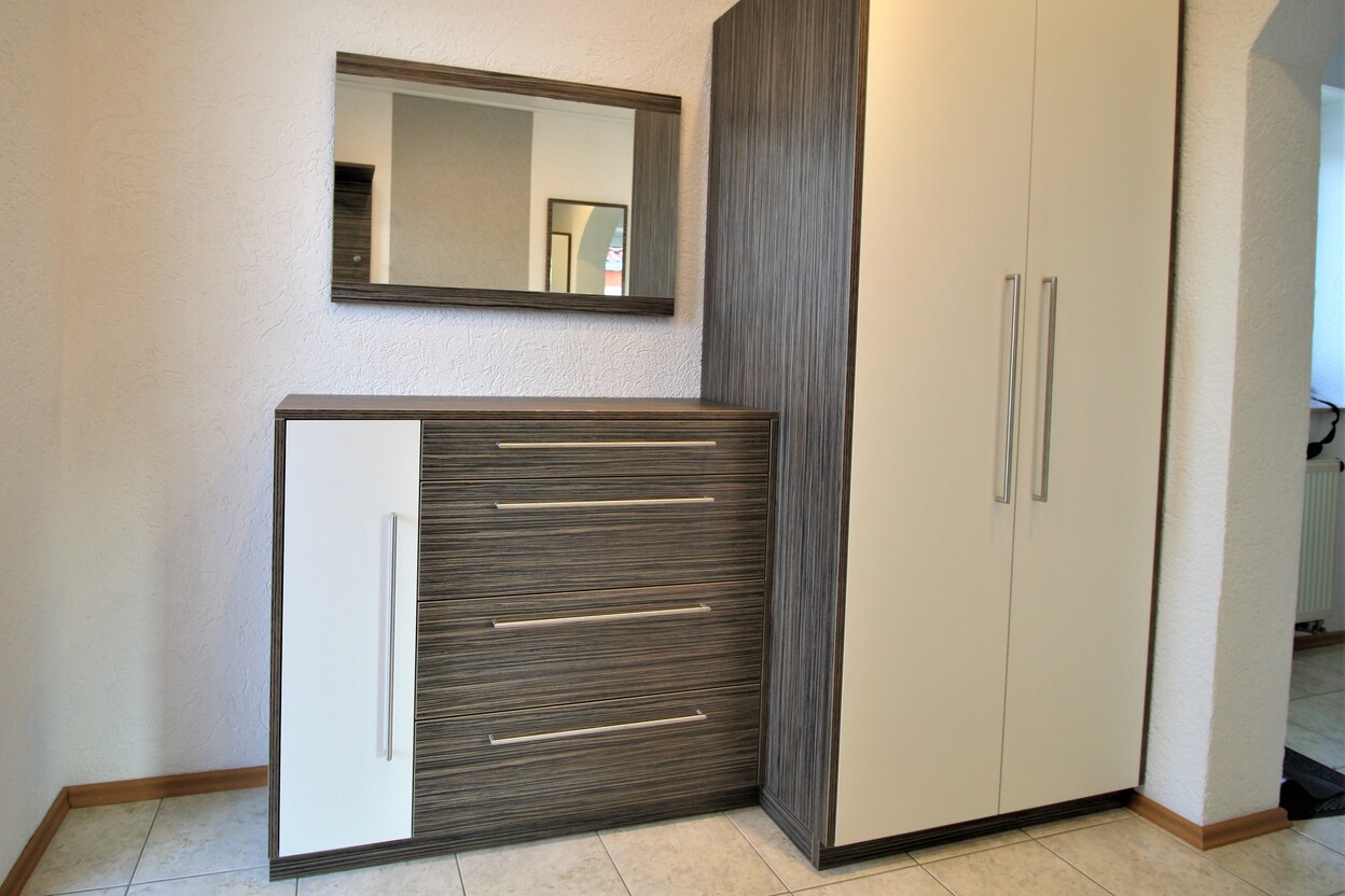 Auf der einen Seite haben wir einen hohen Kleiderschrank mit Drehtüren und einer angegliederten Schubladenkommode mit darüber hängenden Wandspiegel installiert. Hier können hinter den mattweißen Fronten (mit Anti-Fingerprint-Effekt) die persönlichen Schuhe und Kleidungsstücke aufbewahrt werden. Auf der gegenüberliegenden Seite befindet sich eine Wandgarderobe mit Haken, Kleiderstange und Hutablage für Gäste. In einem großen Wandspiegel können sich Gäste wie Bewohner komplett betrachten. Dazwischen befindet sich ein kleines Sitzbänkchen mit Schublade auf dem man sich ausruhen als auch die Schuhe anziehen kann oder die guten Schuhe mit dem nötigen Pflegemittel welches sich in der Schublade befindet auf Hochglanz bringen. Durch die Anordnung der maßgefertigten Möbel an den Wandflächen entsteht in der Raummitte noch genügend Platz um Freunde und Gäste willkommen zu heißen oder zu verabschieden.