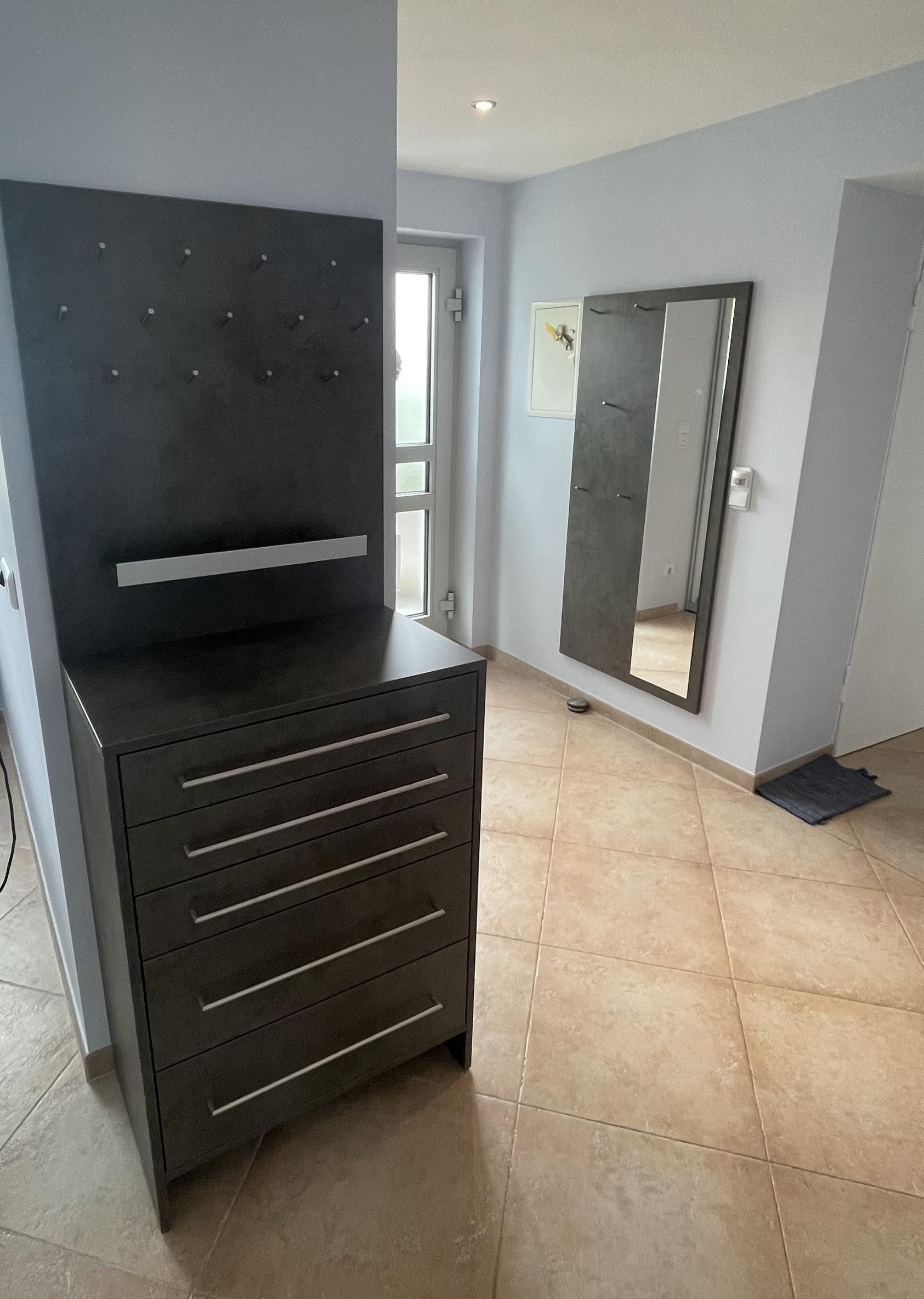 An der gegenüberliegenden Wand haben wir eine Wandgarderobe mit Haken und Spiegel platziert, damit hier die Gäste Ihre Jacken und Mäntel aufbewahren können. Für die kleinen Alltagsgegenstände haben wir eine Kommode in dunkler Betonoptik mit erhöhter Rückwandplatte erstellt. Durch die vielen Schubladen können alle unterschiedlich großen Gegenstände gelagert werden, die nicht jeder sofort im Blick haben sollte. Schlüssel und Handy sind jedoch jederzeit griffbereit an der Rückwand platziert, die Schlüssel sind übersichtlich an den Haken zu finden und das Smartphone findet seinen Platz auf der Ablage. Durch einer Leiste zur rutschsicheren Aufbewahrung ist der Blickkontakt auf das Display immer gewährt.