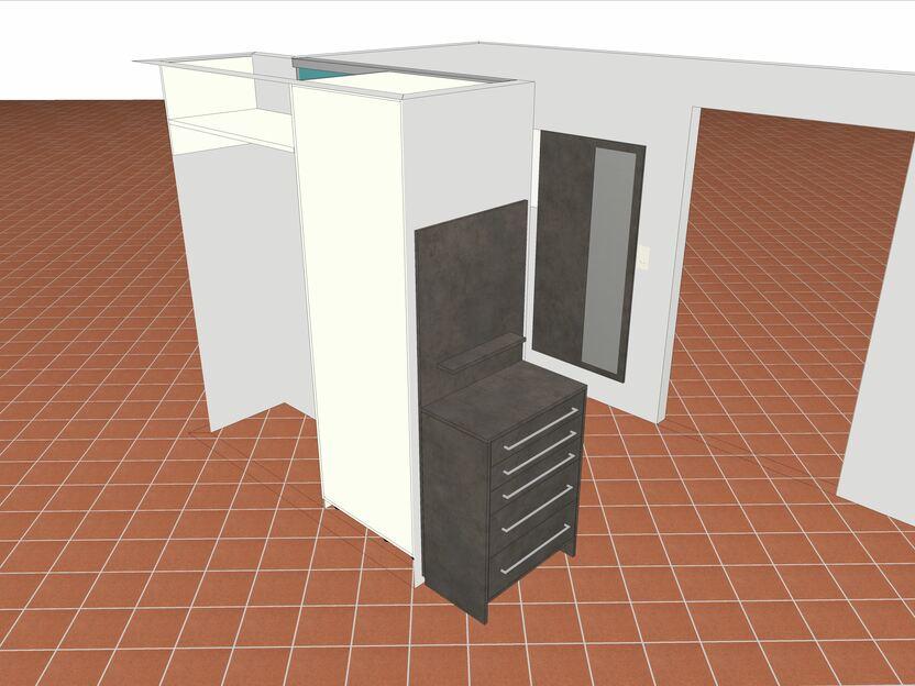 An der gegenüberliegenden Wand haben wir eine Wandgarderobe mit Haken und Spiegel platziert, damit hier die Gäste Ihre Jacken und Mäntel aufbewahren können. Für die kleinen Alltagsgegenstände haben wir eine Kommode in dunkler Betonoptik mit erhöhter Rückwandplatte erstellt. Durch die vielen Schubladen können alle unterschiedlich großen Gegenstände gelagert werden, die nicht jeder sofort im Blick haben sollte. Schlüssel und Handy sind jedoch jederzeit griffbereit an der Rückwand platziert, die Schlüssel sind übersichtlich an den Haken zu finden und das Smartphone findet seinen Platz auf der Ablage. Durch einer Leiste zur rutschsicheren Aufbewahrung ist der Blickkontakt auf das Display immer gewährt.