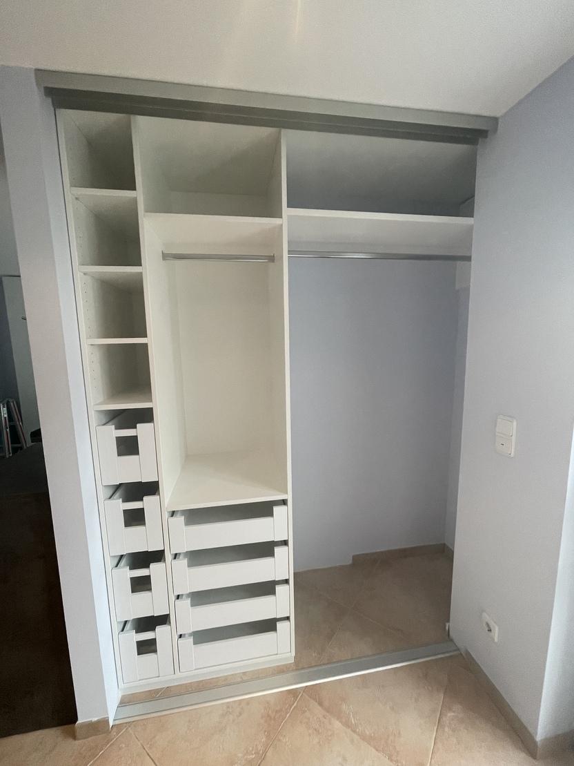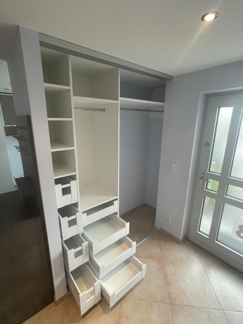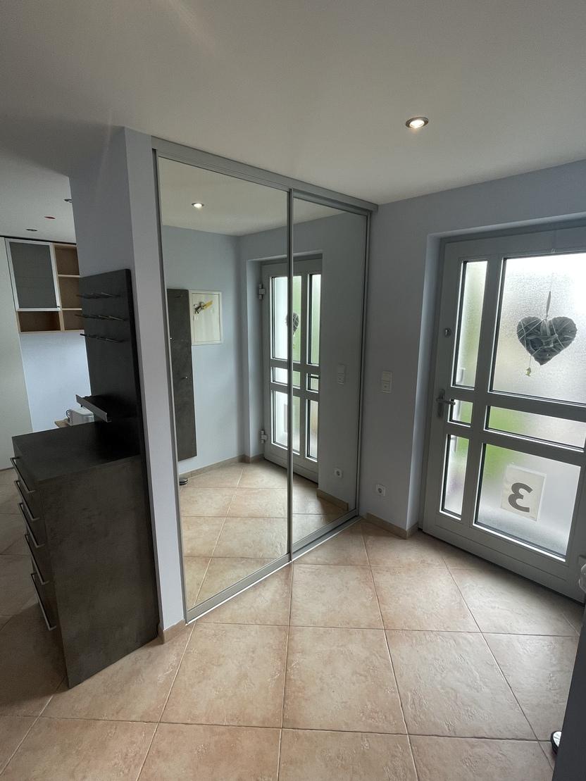 Hier wurde uns die Aufgabe gestellt zum einen viel Stauraum für Schuhe, Jacken, Mützen, Schals, Handschuhe, Schuhputzmittel, Einkaufskorb und Sportartikel für die Hausbewohner zu generieren den man nicht sofort wahrnimmt. Zum anderen einen großzügigen offenen Bereich für die Gästegarderobe und einen leichten Zugriff auf kleine Alltagsgegenstände wie Schlüssel, Geldbeutel, Mobiltelefon, Ladegerät, Briefpost und vieles mehr zu schaffen. Den verborgenen Stauraum haben wir hinter den Alu-Gleitschiebetüren mit Spiegelfüllung geschaffen, die für ein größeres Raumgefühl sorgen und gleichzeitig kann hier vor dem Verlassen des Hauses der letzte prüfende Blick in den Spiegel geworfen werden. Dahinter verbirgt sich dann der gewünschte Stauraumschrank mit Innenschubkästen, Einlegeböden und Kleiderstangen.