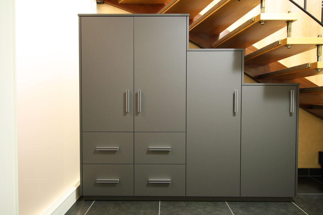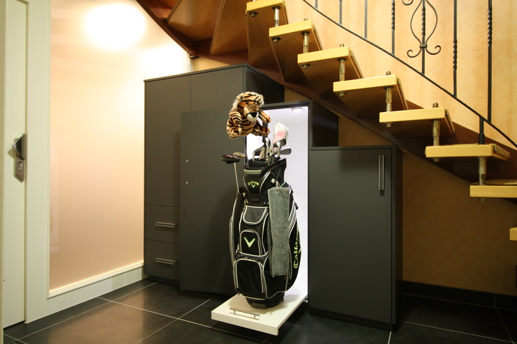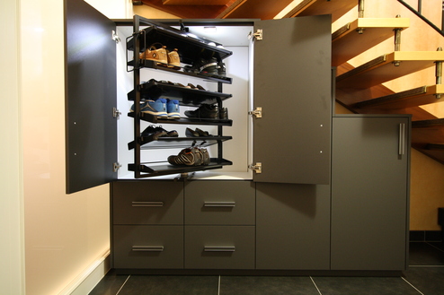 Diesen besonderen Schuhschrankbeschlag gibt es auch noch in einer weiteren Größe, in dem dann bis zu 50 Paar Schuhe geordnet Platz finden. Der Schrank bietet unter anderem auch noch Platz für ein gefülltes Golfbag, welches bequem durch einen Auszugsboden herausgefahren werden kann. Ebenso lassen sich Taschen in einem weiteren Fach sowie Kleinigkeiten in den 4 Schubladen unterbringen.