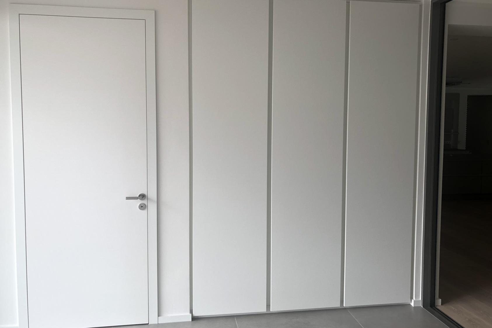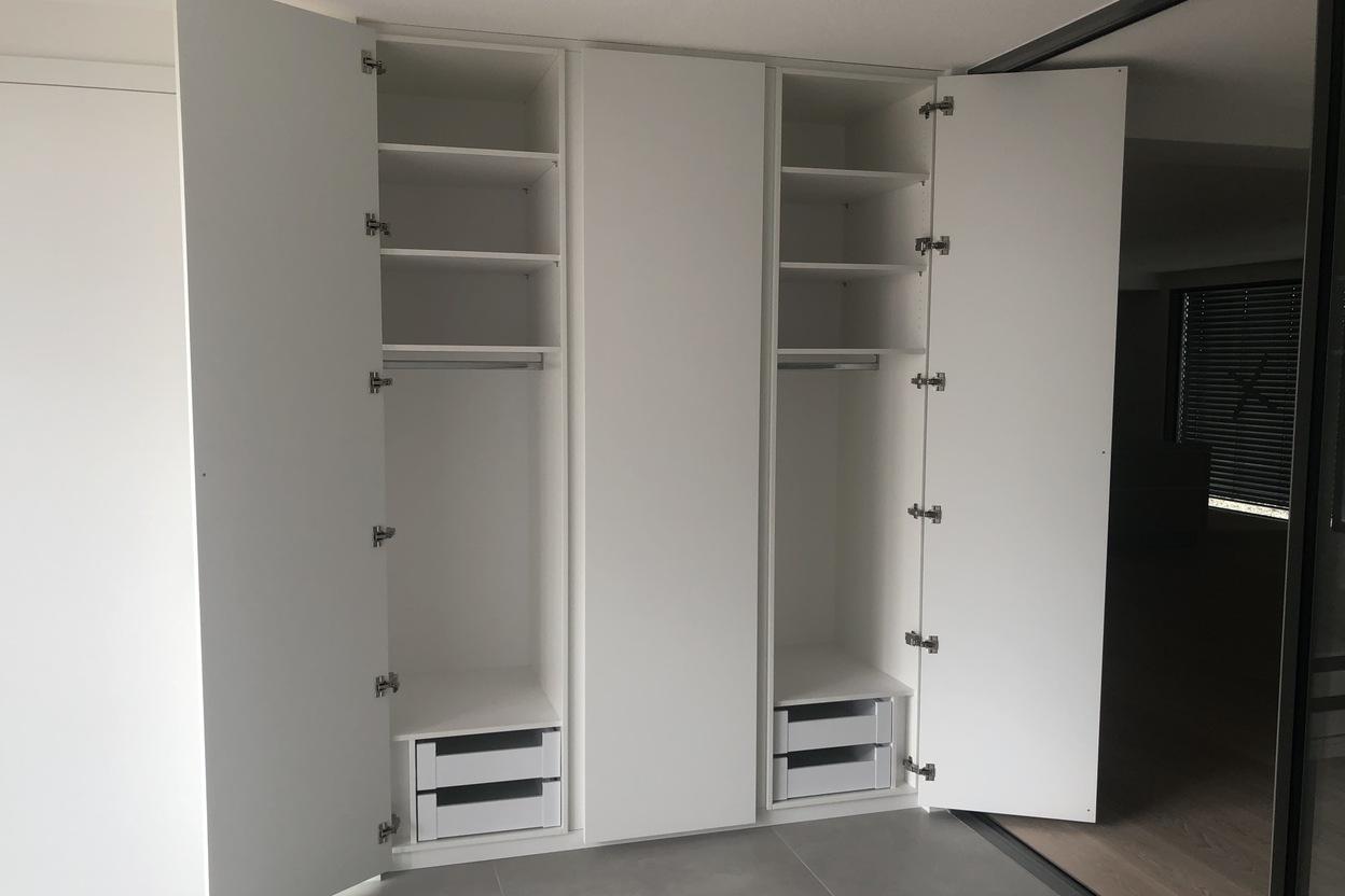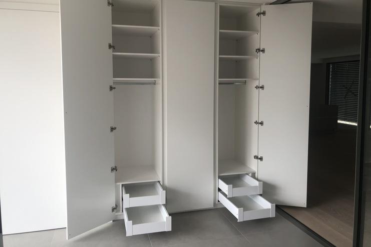 Von außen sind nur Schattennuten (welche als Griffleisten fungieren) und glatte Lackfronten mit Anti-Fingerprint-Eigenschaften zu sehen. Hinter den raumhohen Türfronten (welche sich 170 Grad öffnen lassen) verbirgt sich das Innenleben der Garderobe mit viel Stauraum durch Kleiderstangen, Schubkästen und Einlegeböden.