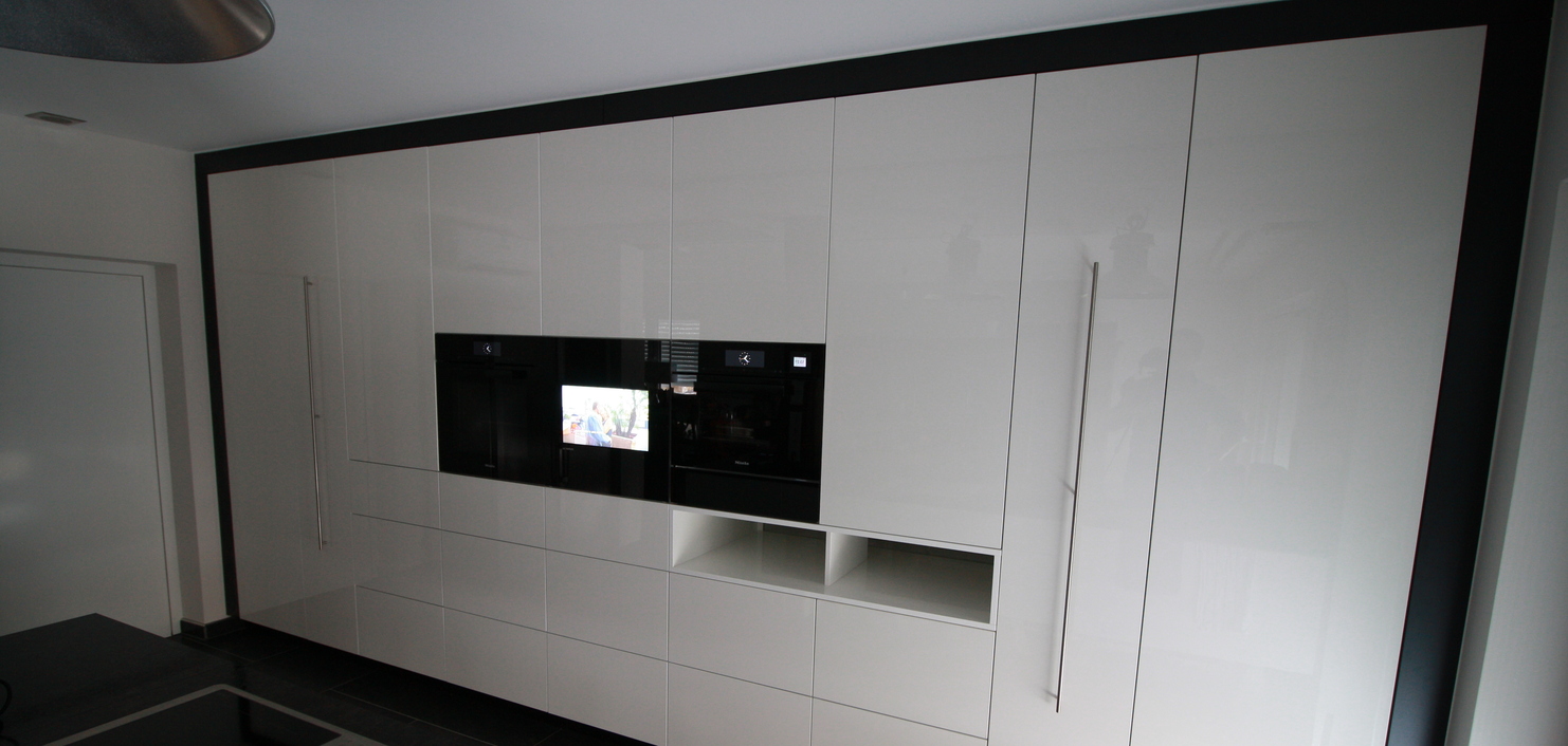 - Hochschrank für Dampfgarer und Wärmeschublade mit 2 Schubkästen und einem offenen Fach. Dieses ist hinten mit einer Glasscheibe versehen und gibt den Mauerdurchblick in den angrenzernden Raum frei .