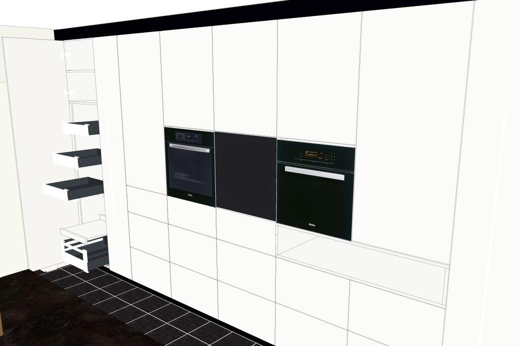 - 2 x Hochschrank als Vorratsschrank mit Schubkästen und Tablarauszügen hinter einer Drehtür.
