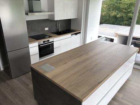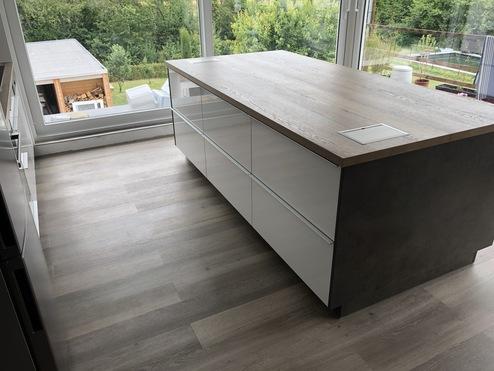 Diese schöne Küche mit Mittelblock in Hochglanz weiß, Halifax Eiche und Beton dunkel haben wir geplant, gebaut und montiert. In der hinteren Küchenzeile befindet sich Kochfeld mit Einbaubackofen, Spülbecken und Geschirrspülmaschine, sowie kleinere Schubkasten-Schränke und ein Mülltrennsystem.