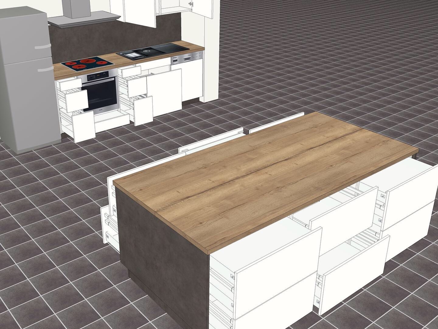 In den Mittelblock sind Schubkästen mit hoher Traglast von beiden Seiten angeordnet, um beidseitig am Mittelbloch arbeiten zu können. Durch die versenkbaren Steckdosen, welche in die Arbeitsplatte integriert sind, ist es möglich dass alle wichtigen Elektrogeräte griffbreit zur Verfügung stehen können. Unsere Kunden bietet die Küche viel Stauraum, gleichzeitig können Sie die die Aussicht beim Zubereiten und Kochen genießen, oder tolle Küchenpartys feiern.