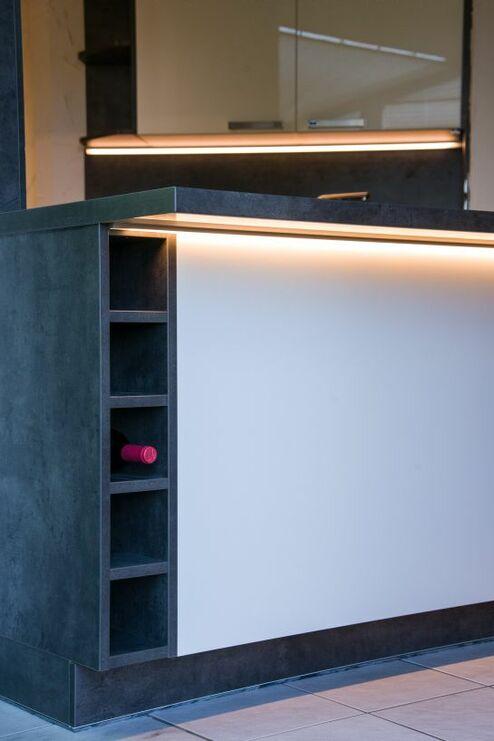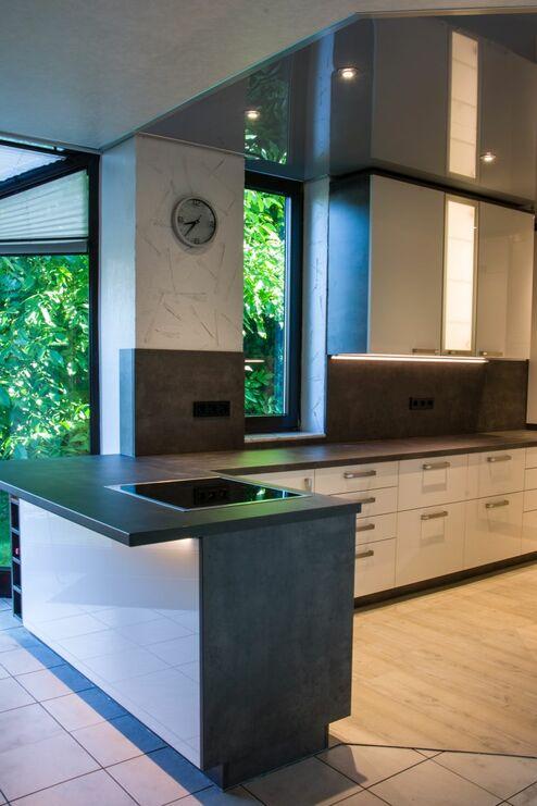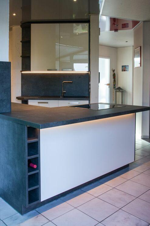 Zum Wohnraum offene Küche in U-Form mit Kochinsel und Thekenkombination in Hochglanz weiß mit Kombinationsdekor “Beton dunkel”. Die Küche wurde über drei Wandflächen eingebaut, um möglichst viel Stauraum zu erhalten und jeden Zentimeter zu nutzen.