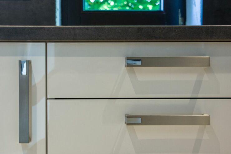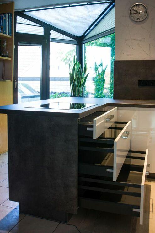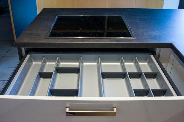 - Schubkasten-Unterschrank (900 mm breite) mit 3 Schubkästen in unterschiedlicher Höhe 1 x mit Besteckeinteilung und darüber ein eingebautes Induktionskochfeld und verlängerter Arbeitsplatte als Theke