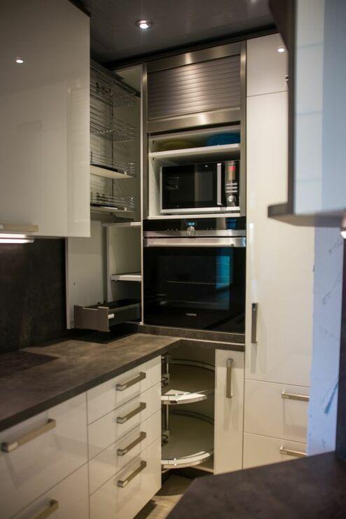 - Aufsatzschrank für Einbaubackofen und darüber ein Rolloschrank für die Microwelle mit weiterem Staufach.