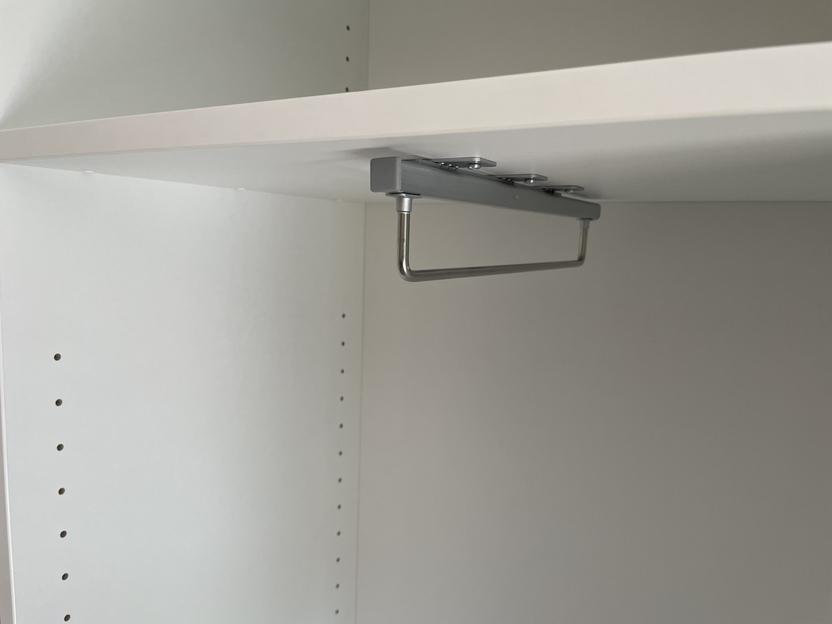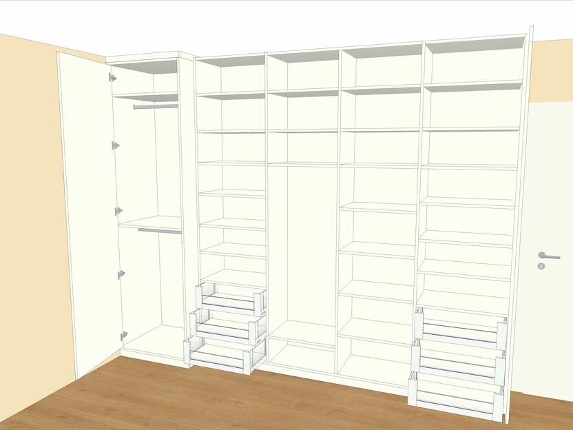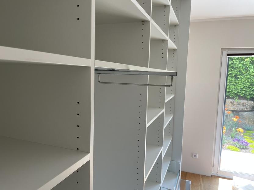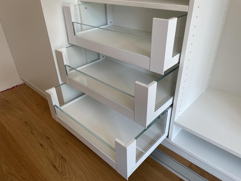 Am Innenleben des Schrankes ist gut zu erkennen, dass Stauraumoptimierung und Platzbedarf wichtige Themen bei der Schrankplanung waren. Im tiefen Schrankabteil links mit der grifflosen Drehtür finden auf 2 Ebenen über Kleiderstangen die hängenden Kleidungsstücke wie Blusen, Hemden, Anzüge und Sackos ihren Platz. Ein Staufach unter der Decke bietet hier auch noch Raum für Bettwäsche, Decken oder ähnliches. Durch den großen Spiegel auf der Türinnenseite hat man bei Bedarf die Möglichkeit sich von Kopf bis Fuß zu betrachten. Ansonsten verschwindet der Spiegel im Schrank und beeinflusst nicht die Schrankoptik von aussen. Im großen Schrankteil sorgen jede Menge Einlegeböden (welche durch Lochreihenbohrungen flexibel verstellbar sind) für viel Stauraum, um liegende Kleidung wie T-Shirts, Polo-Shirts, Pullover, Jeans oder auch Bettwäsche und Handtücher unter zu bringen. In den Innenschubladen mit Glasfront und Glasseiten finden Unterwäsche und Socken Ihren geordneten Platz. Für leichte Sommerkleider oder lange Abendkleider ist auch ein großes Fach mit ausziehbarer Kleiderstange in den Schrank integriert worden.