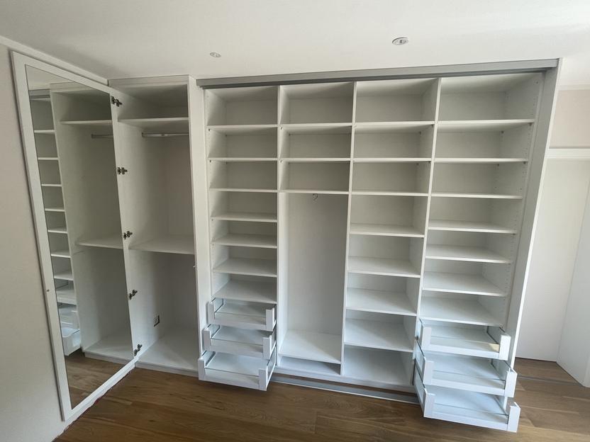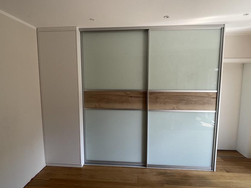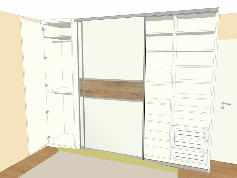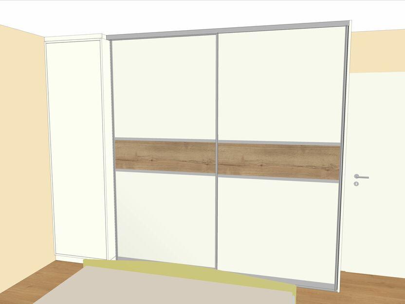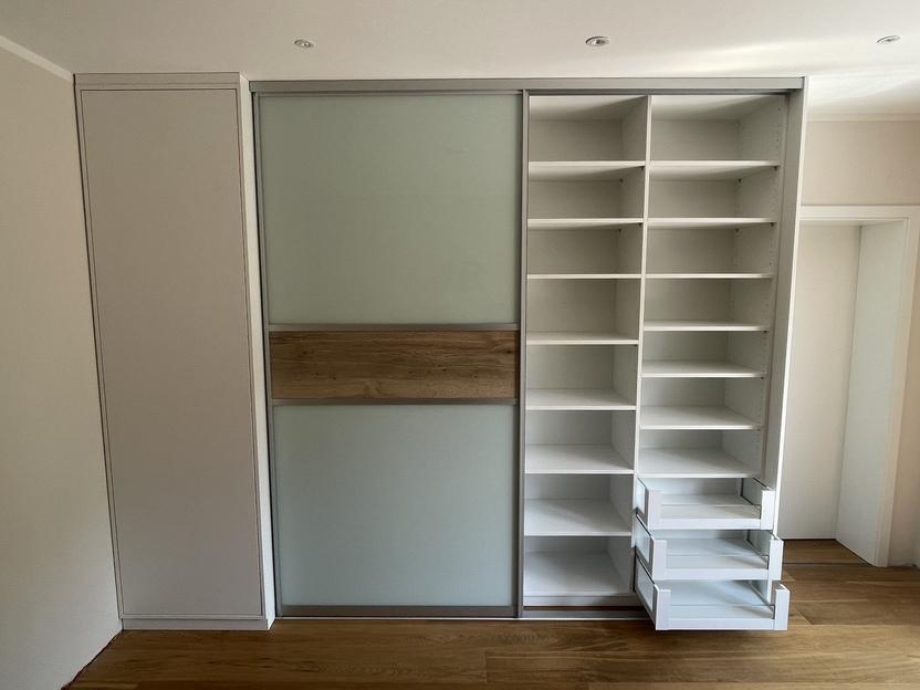 Der Kundenwunsch war, so viel Stauraum wie möglich an dieser Wand des Schlafzimmers zu generieren. Es sollten viele Fächer für liegende Kleidung geschaffen werden, aber auch für hängende Kleidungsstücke sollte ein gewisser Platz zur Verfügung stehen. Da das Bett auf der gegenüberliegenden Wand platziert werden soll und noch ein bequemer Durchgang und eine gute Schrankbedienung gewährleistet sein sollte, haben wir hier Alu-Gleitschiebetüren eingesetzt und den Schrank gesplittet. Wichtig war auch das Design, welches modern, nicht zu unruhig und klare Linien haben sollte, aber auch etwas Wärme und Natürlichkeit vom Parkettboden beinhalten sollte. Bei dem raumhohen Einbauschrank haben wir das linke Abteil tiefer gezogen und es nach vorne überstehen lassen um hier hängende Kleidung unter zu bringen. Dieses Abteil ist ganz schlicht mit einer grifflosen Tür in weiß gehalten. Der Hauptteil für liegende Kleidung ist mit 2 großen Alurahmen-Gleitschiebetüren mit Lackglasfüllung und mittiger Holzfüllung verschlossen und durch die Schiebetüren leicht zu bedienen.