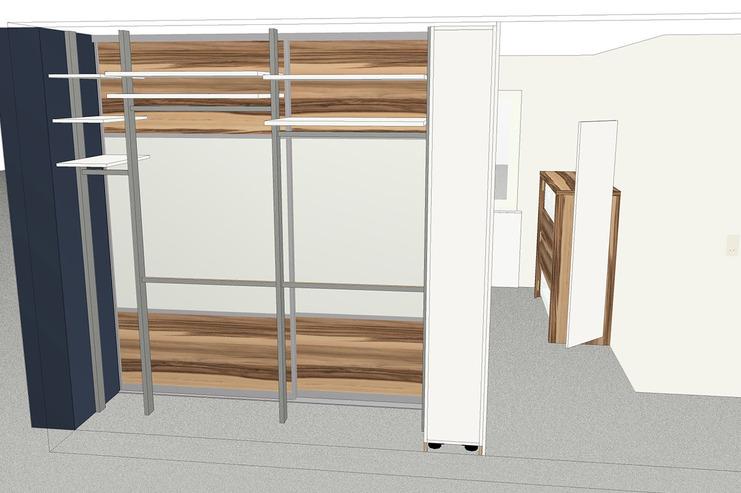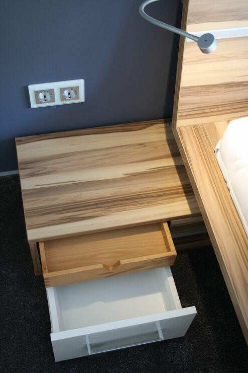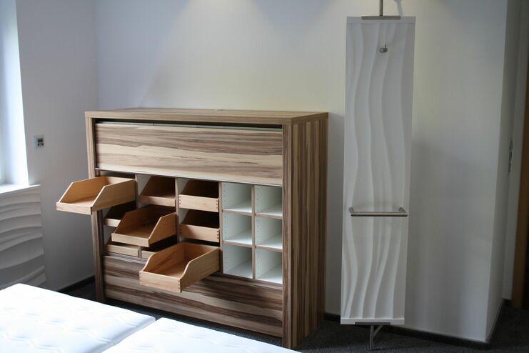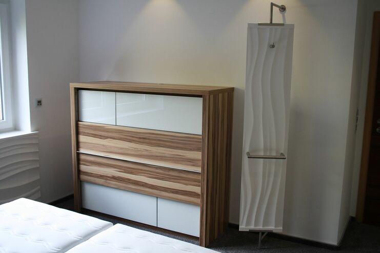 Im Mittelpunkt steht hier das Designbett mit integrierter LED-Beleuchtung, Soundsystem und angebundenen Nachttischen. Das besondere ist hier auch die Liegefläche im Sondermaß von 1700 mm Breite. Der raumhohe Kleiderschrank mit Gleitschiebetüren hat im Inneren links einen schmalen Korus für liegende Kleidung z. T. auch mit Tablarauszügen, sowie im restlichen Teil ein HETTICH Regalsystem “Amari 200” mit flexibel verstellbaren Kleiderstangen und Einlegeböden. Die Außenwand des Schrankes wurde aus MEISTER System-Paneele mit Einhängeschienen hergestellt (z.T. im Inneren stromführend für die Flexleuchte), um hier Kleiderhaken flexibel einzuhängen und Kleidung zwischenzuparken oder zu lüften.