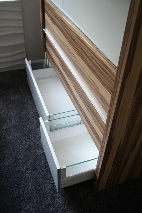 Diese komplette Schlafzimmereinrichtung haben wir nach Maß geplant, gefertigt und montiert. Die Möbel sind aus EGGER Dekorspanplatten “Caribbian Wallnut natur” in Kombination mit “Premiumweiß” und Lackglasflächen.