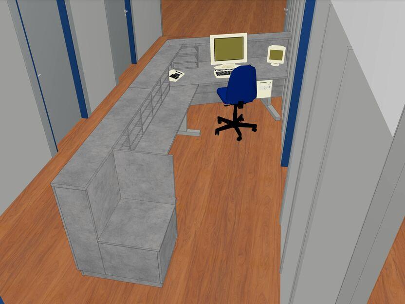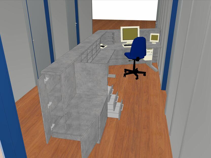Auch die Räumlichkeiten des Empfangsbereiches und der geforderte vollwertige Arbeitsplatz spielten bei der Planung und Umsetzung ein wichtige Rolle. Durch den schmalen aber langen Raum konnte die Theke hauptsächlich in die Länge gebaut werden. Gleichzeitig musste ein ergonomischer Arbeitsplatz mit optimierten Arbeitsabläufen integriert werden. Durch die schräglaufende L-Form ist es gelungen den ankommenden Mandanten mit Blickkontakt zu begrüßen sowie Ablage- und Aktenarbeiten seitlich zu erledigen. Für genügend Ordnung & Stauraum sorgen die Sortierfächer unter dem Thekenbrett. Der Platz für den Multifunktionsdrucker gewährt von allen Seiten guten Zugang und hinter den grifflosen Türen verbergen sich noch Staufächer für Ordner, Formulare, Papier, Tinte, Toner & Co, ebenso in dem Rollcontainer, welcher durch Herausziehen noch eine zusätzliche Ablagefläche unter der Arbeitsplatte bietet.