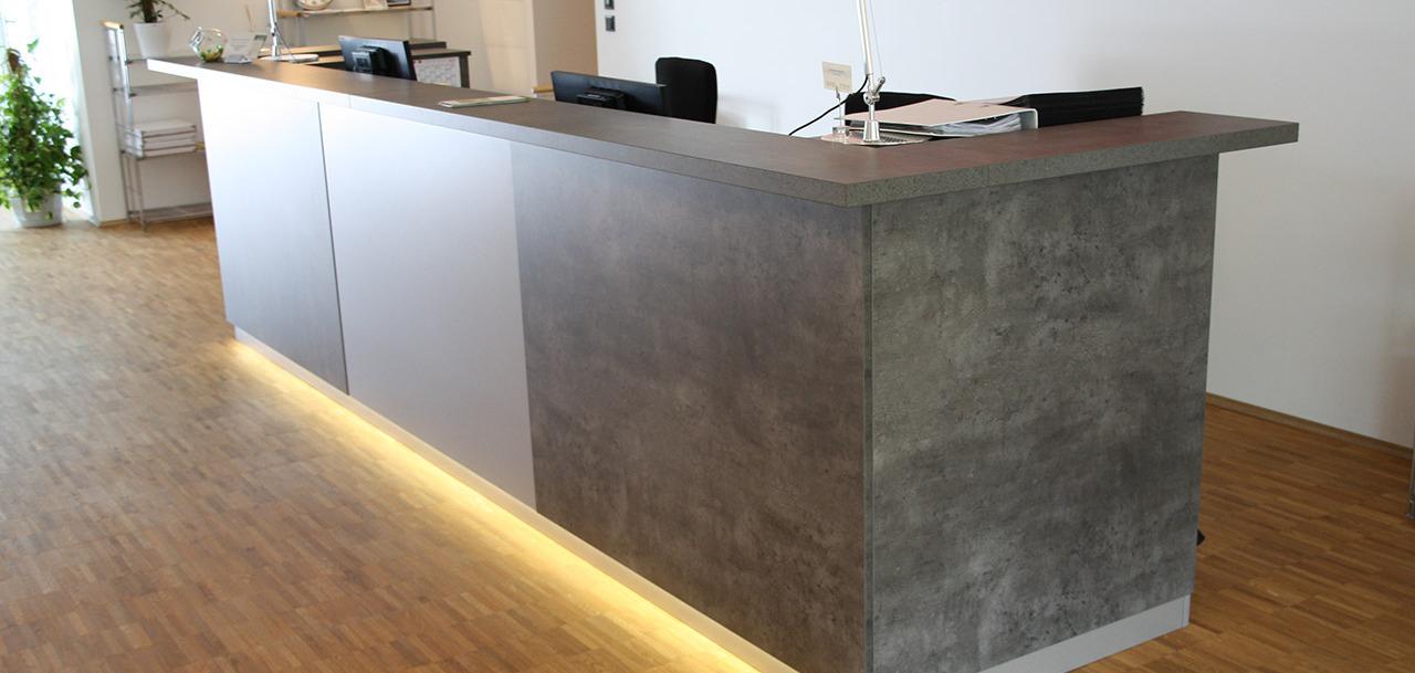 Diese repräsentative Empfangstheke in Dekor “Beton dunkel” mit dem Kombinationsdekor “Titan” und LED- Sockelbeleuchtung ist die erste Anlaufstelle für Besucher und bietet dahinter zugleich 2 vollwertige PC-Arbeitsplätze mit Aktenregal.