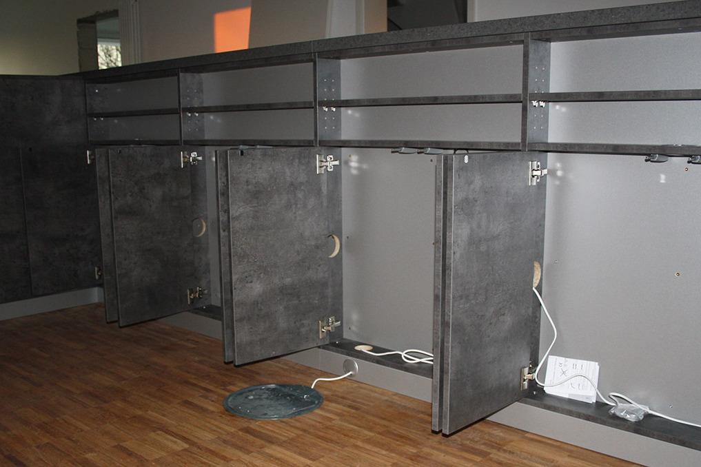 Hinter der Thekenfront befinden sich Kabelfächer, die mit grifflosen Türen verschlossen sind, um die gesamten Kabelverbindungen verdeckt verlegen zu können. Auch hier war eine vorherige 3D-Planung sehr wichtig, um die Proportionen und vorgegebenen Schreibtischmaße im Vorfeld miteinander zu optimieren.