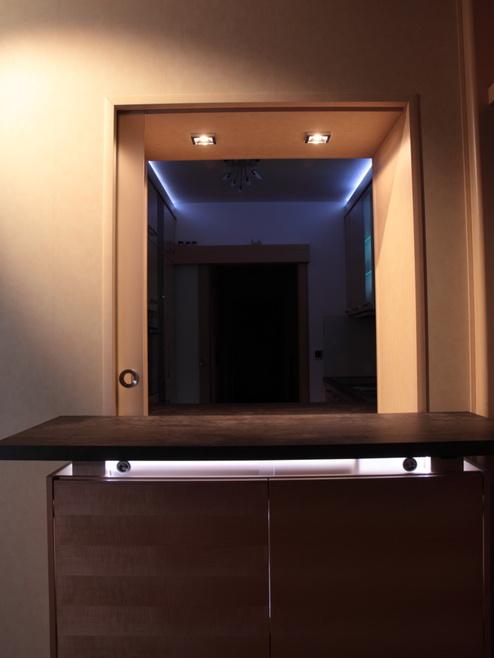Da die Küche mit Arbeitsplatte hinter der Theke liegt, können aus der Küche Speisen und Getränke gereicht werden und zugleich kann die beliebte Küchenparty mit der Coktailparty kombiniert werden. Bei dem Herausfahren der Thekenplatte kommt ein darunterliegender Korpus mit satinierten Glasschiebetüren zum Vorschein. In diesem Staufach lassen sich Kleinigkeiten wie z. B. Servietten, Strohhalme und Untersetzer verstauen. Ebenfalls wurde hier ein Miniregal für Fernbedienung der Haustechnik untergebracht.