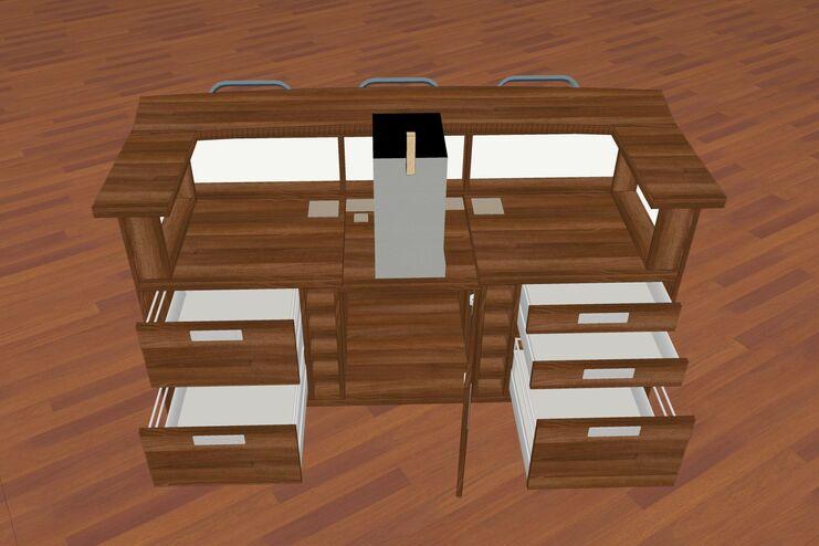 Durch die integrierte LED-Beleuchtung in der Frontpartie, dem Sockelbereich sowie dem hinteren Schankbereich, ist die Theke immer ein Blickfang. Mit der in die Frontpartie integrierten RGB-Farbwechsel-LED-Beleuchtung passt sich die Theke jedem Ambiente und jeder Partystimmung an. Gut zu sehen ist auch die realitätsnahe 3D-Planung der Theke, in der alle Details genau geplant und umgesetzt werden konnten. Die mobile Theke ist ausgestattet mit einem geräuschgedämpften Minibar-Kühlschrank, 2 versenkbaren Steckdoseneinheiten, einer elektrischen Zapfanlage für 5 Liter Partyfässchen, Gläserregalen unter dem Thekenbrett, 2 offenen Weinflaschenregalen, 2 Gläserschubladen, 2 Besteck- & Kleinteileschubladen, 1 Flaschenschublade.