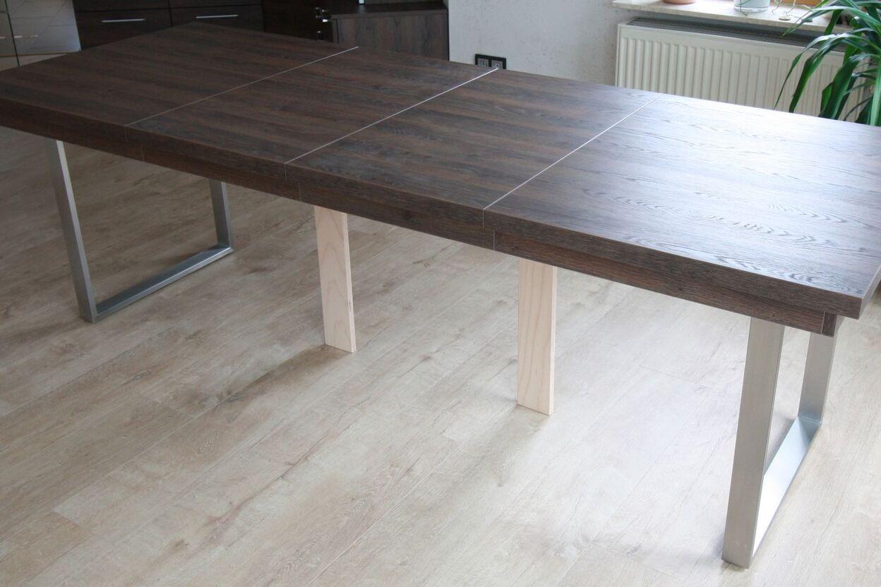 Dieser ausziehbare Esstisch aus 38 mm EGGER Dekorplatte Feelwood H3325 ST28 “Gladstone Oak tabak” ist mit einem Kulissenauszug ausgestattet.