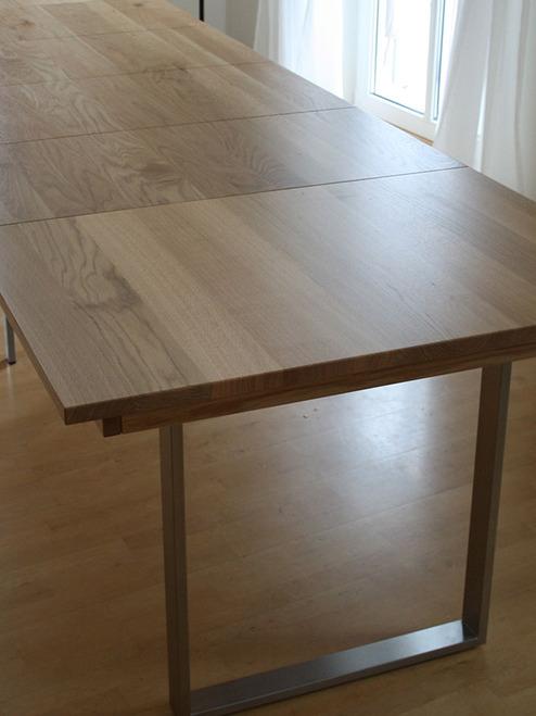 Dadurch kann der Grundtisch von 140 cm Länge x 100 cm Breite durch Einsetzen von 4 Einlegeplatten mit je 49 cm Länge zu einem maximalem Gesamttisch von 336 cm Länge ausgebaut werden. Somit bietet der Tisch ein Platzangebot für 4-6 Personen vom Grundtisch bis zu 12-14 Personen bei voll ausgezogenem Tisch für die Festtagstafel. Durch das U-förmige Edelstahl Tischgestell sowie die geradlinige und dünne Tischplatte wirkt der Tisch trotz seiner massiven Eicheplatte sehr leicht.